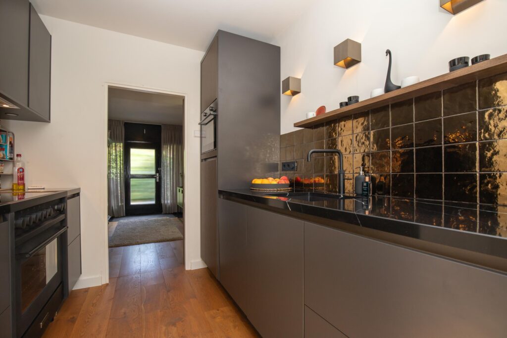 Je stapt binnen in een royale hal die toegang geeft tot alle vertrekken. Aan de voorzijde ligt de lichte, woningbrede woonkamer met mooie eikenhouten vloer en grote raampartijen die zorgen voor een prettige lichtinval. De keuken is modern en praktisch ingedeeld met twee tegenover elkaar geplaatste keukenblokken, voorzien van hoogwaardige inbouwapparatuur: een Boretti fornuis (90 cm breed, 6-pits) met grote oven en afzuigkap, Quooker, vaatwasser, koelkast, combi-oven én een ruime vaste voorraadkast. De hal leidt verder naar een modern vrijhangend toilet met fonteintje, een volledig betegelde badkamer met comfortabel ligbad, aparte douche, stijlvol wastafelmeubel en ruimte voor de wasmachine.