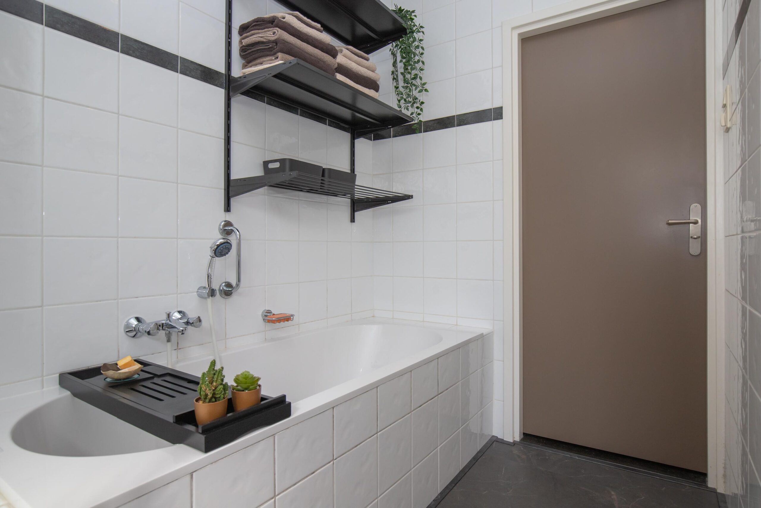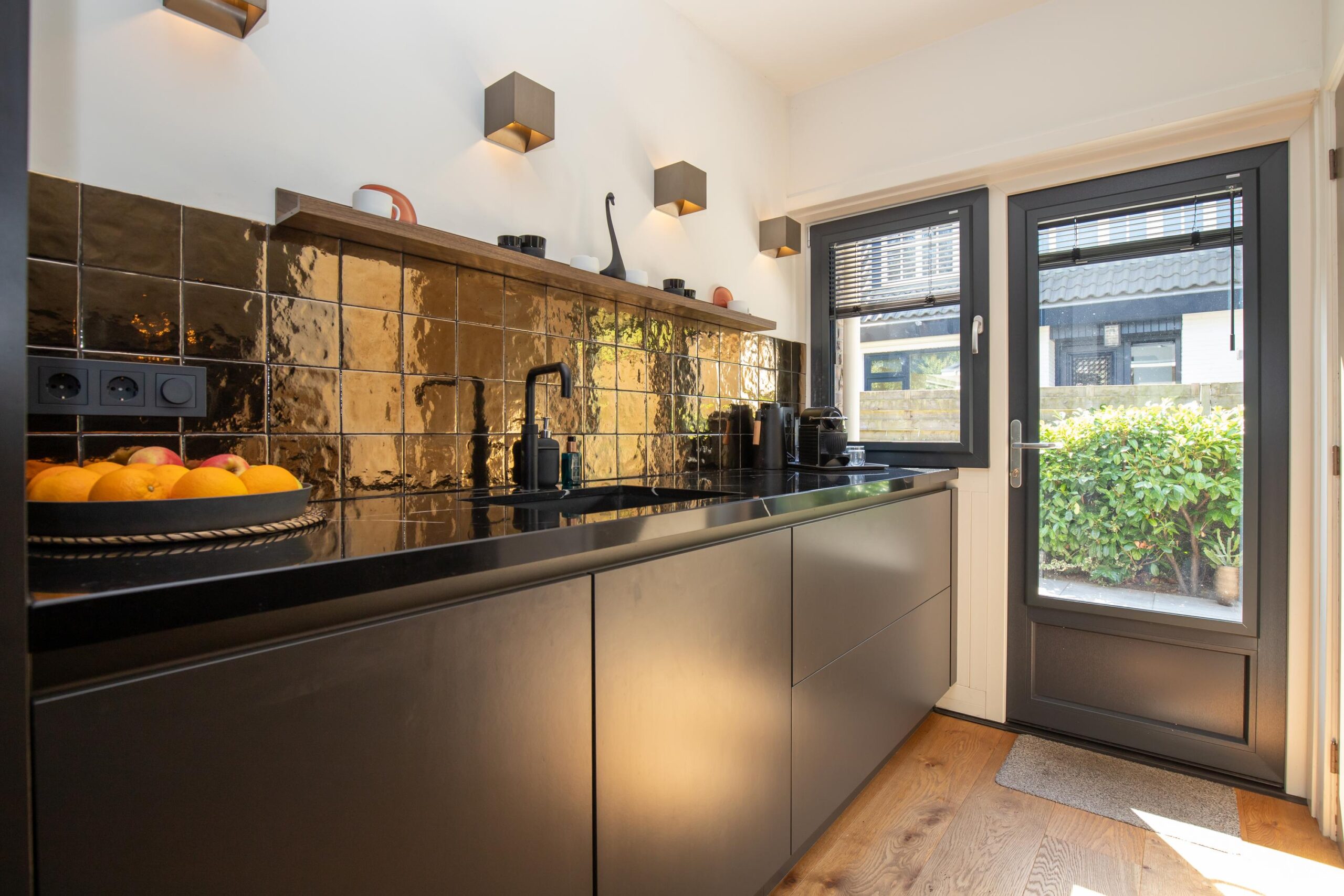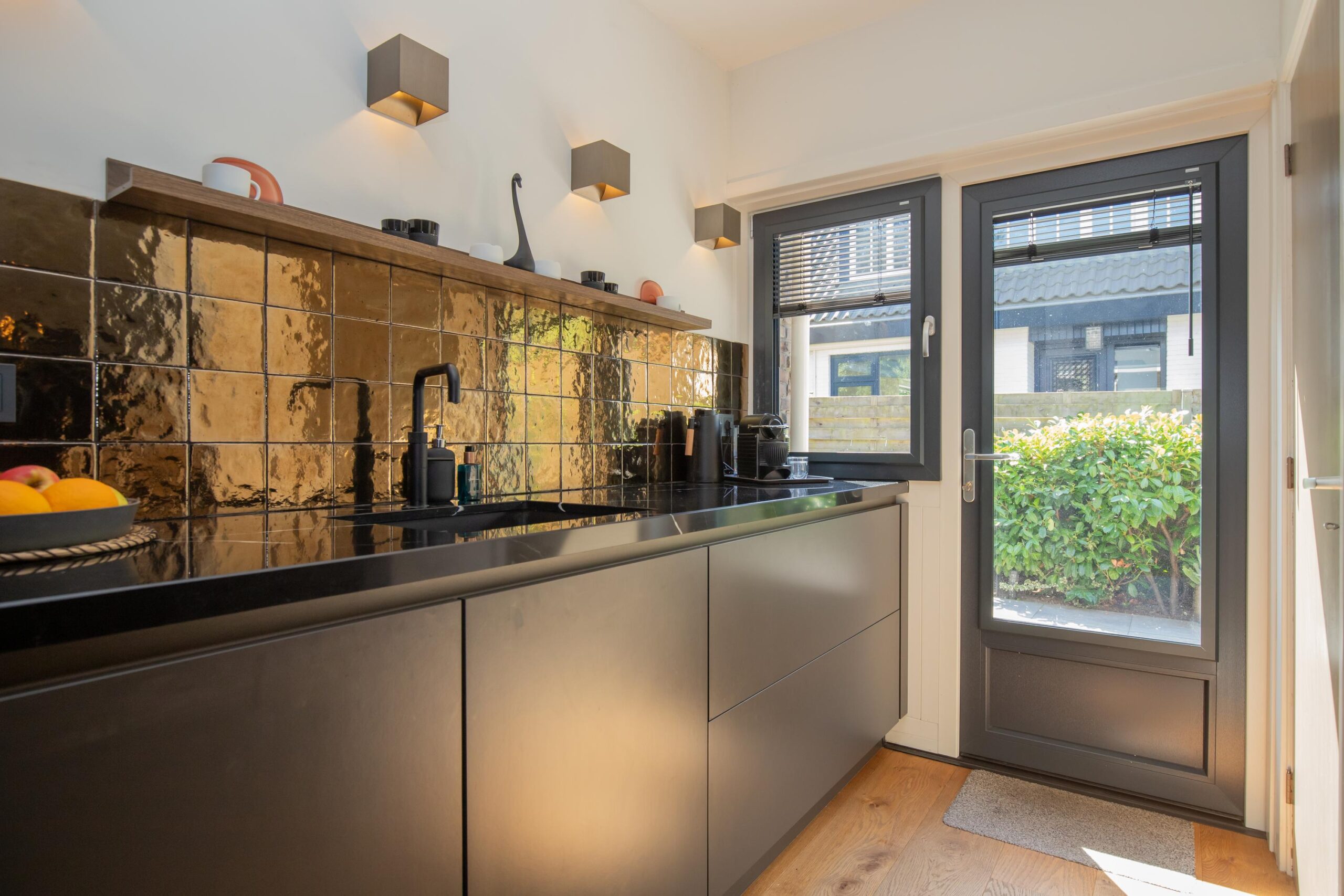 Je stapt binnen in een royale hal die toegang geeft tot alle vertrekken. Aan de voorzijde ligt de lichte, woningbrede woonkamer met mooie eikenhouten vloer en grote raampartijen die zorgen voor een prettige lichtinval. De keuken is modern en praktisch ingedeeld met twee tegenover elkaar geplaatste keukenblokken, voorzien van hoogwaardige inbouwapparatuur: een Boretti fornuis (90 cm breed, 6-pits) met grote oven en afzuigkap, Quooker, vaatwasser, koelkast, combi-oven én een ruime vaste voorraadkast. De hal leidt verder naar een modern vrijhangend toilet met fonteintje, een volledig betegelde badkamer met comfortabel ligbad, aparte douche, stijlvol wastafelmeubel en ruimte voor de wasmachine.