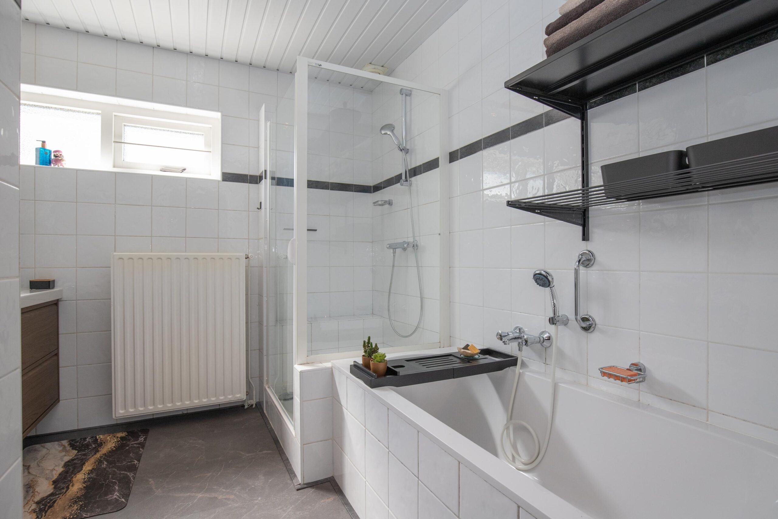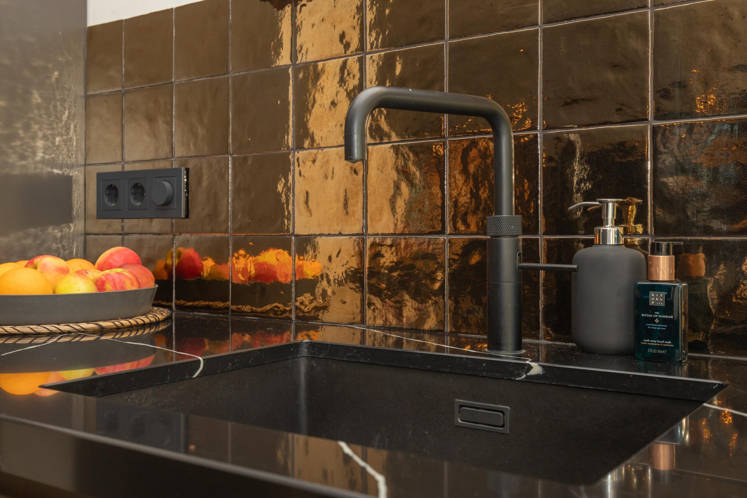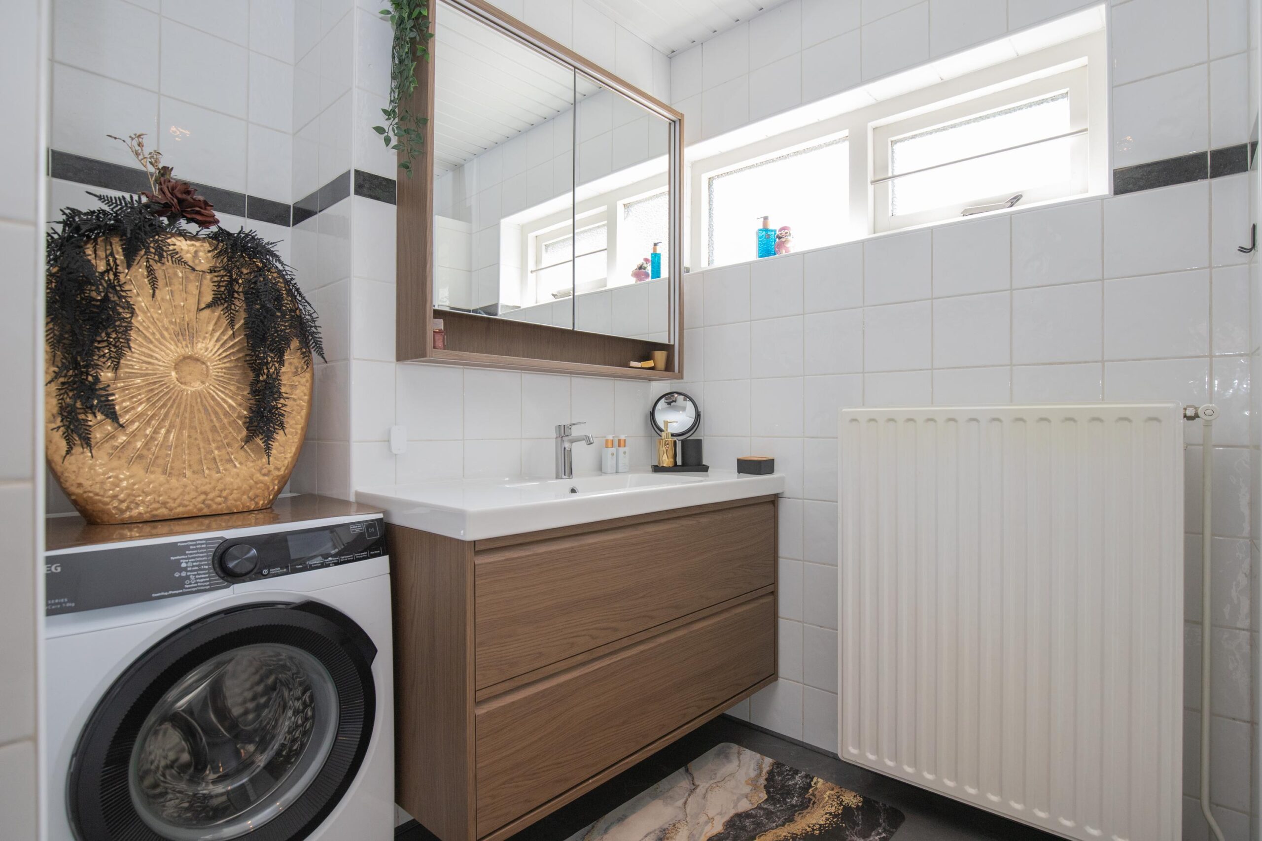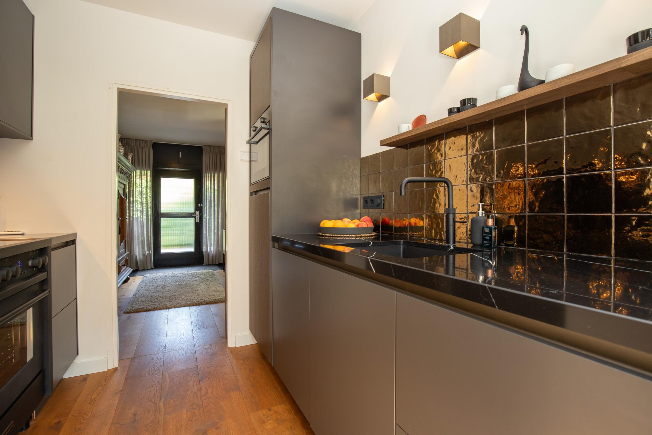 Je stapt binnen in een royale hal die toegang geeft tot alle vertrekken. Aan de voorzijde ligt de lichte, woningbrede woonkamer met mooie eikenhouten vloer en grote raampartijen die zorgen voor een prettige lichtinval. De keuken is modern en praktisch ingedeeld met twee tegenover elkaar geplaatste keukenblokken, voorzien van hoogwaardige inbouwapparatuur: een Boretti fornuis (90 cm breed, 6-pits) met grote oven en afzuigkap, Quooker, vaatwasser, koelkast, combi-oven én een ruime vaste voorraadkast. De hal leidt verder naar een modern vrijhangend toilet met fonteintje, een volledig betegelde badkamer met comfortabel ligbad, aparte douche, stijlvol wastafelmeubel en ruimte voor de wasmachine.