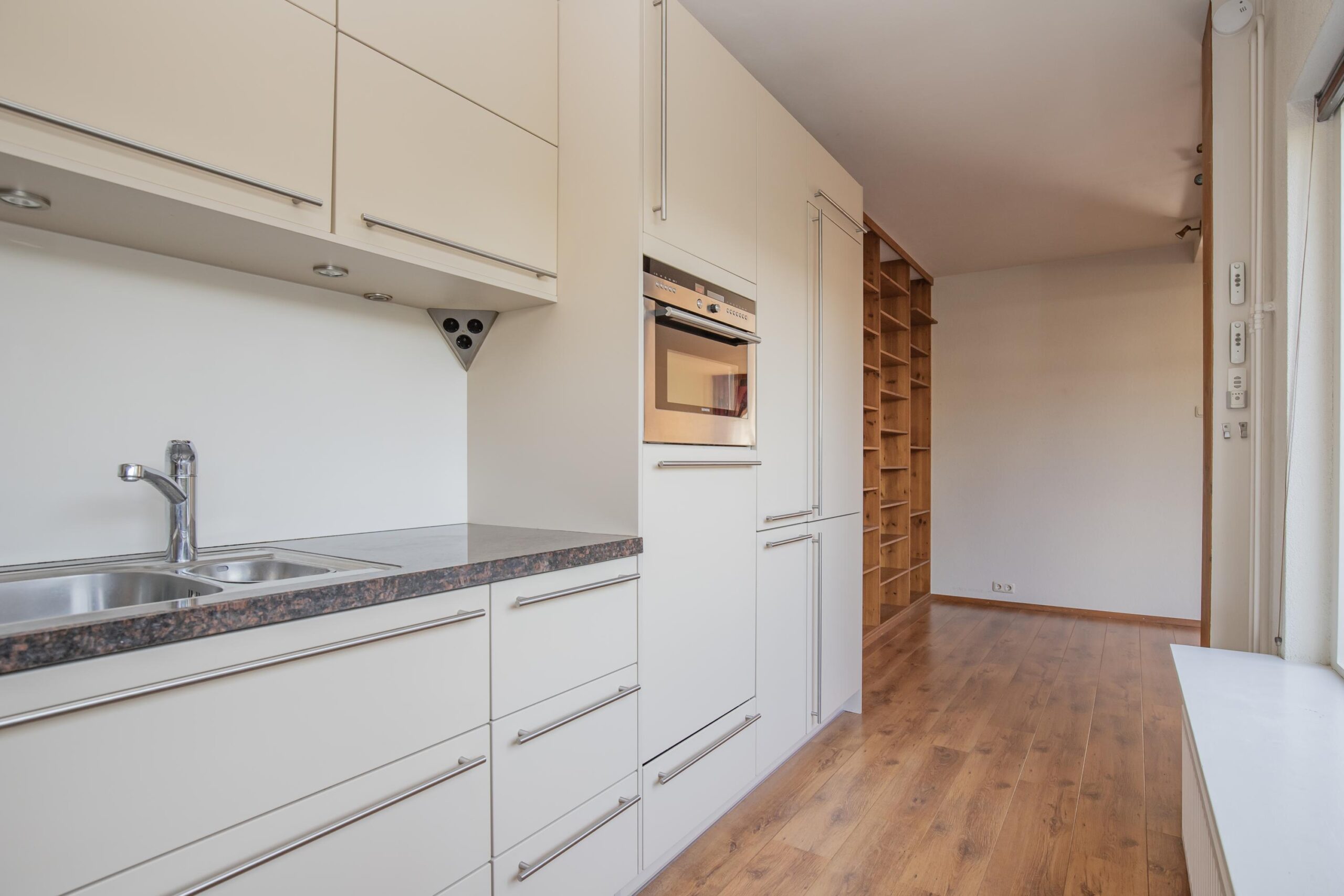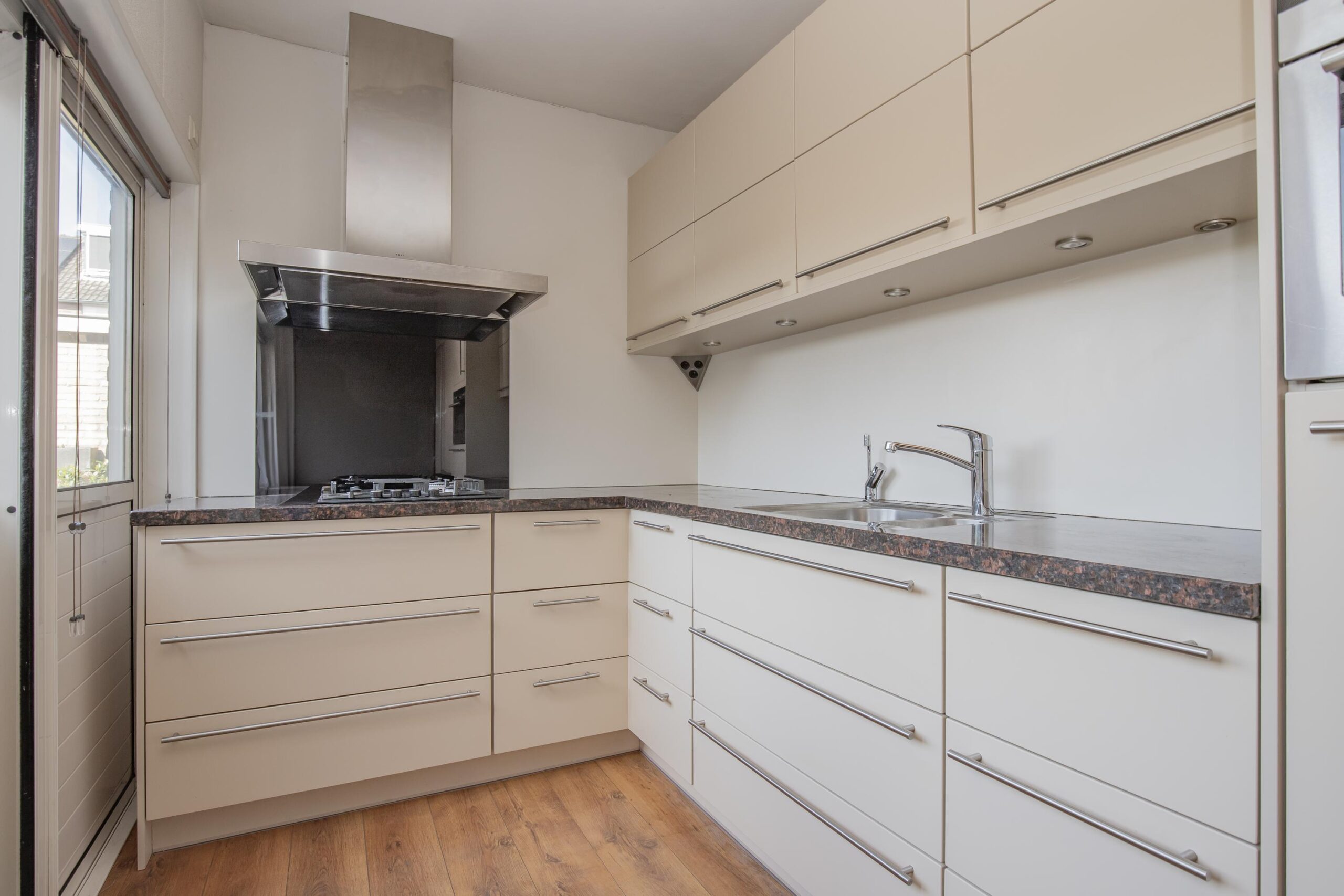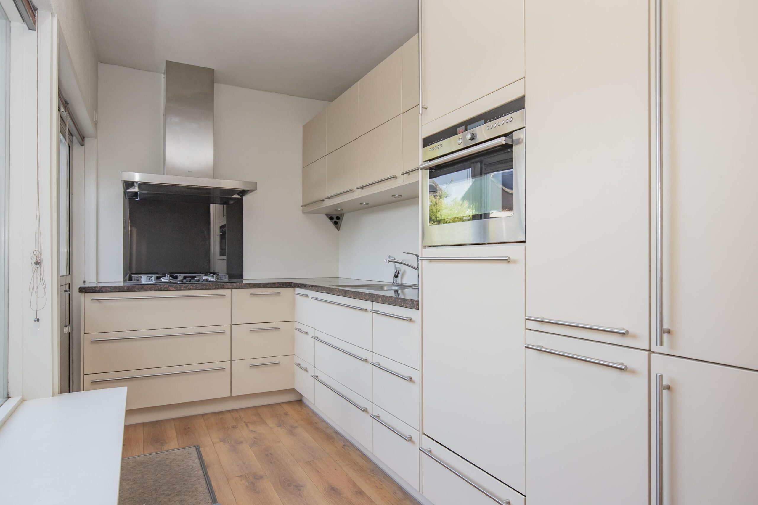 Aan de achterzijde is de woning uitgebouwd, waardoor de open keuken alle ruimte krijgt. De keuken in L-opstelling is praktisch en voorzien van diverse inbouwapparatuur en volop kastruimte. Via de schuifdeur loop je zo de tuin in, waar binnen en buiten moeiteloos in elkaar overlopen.