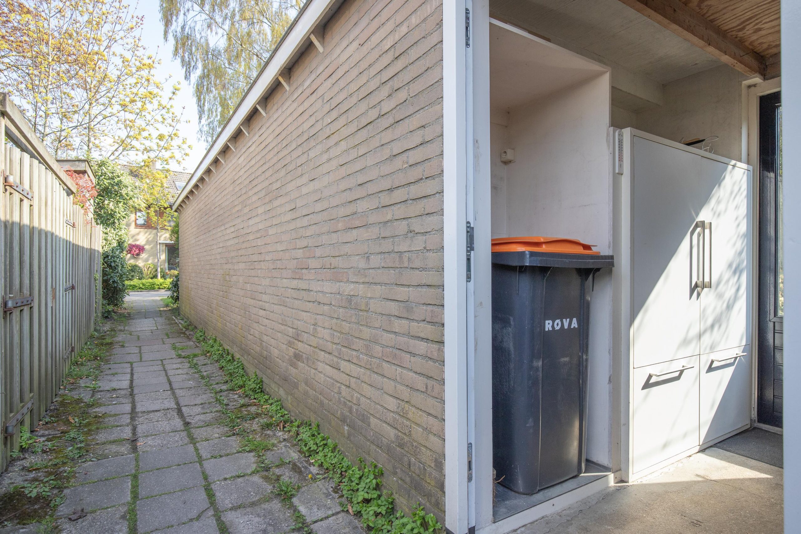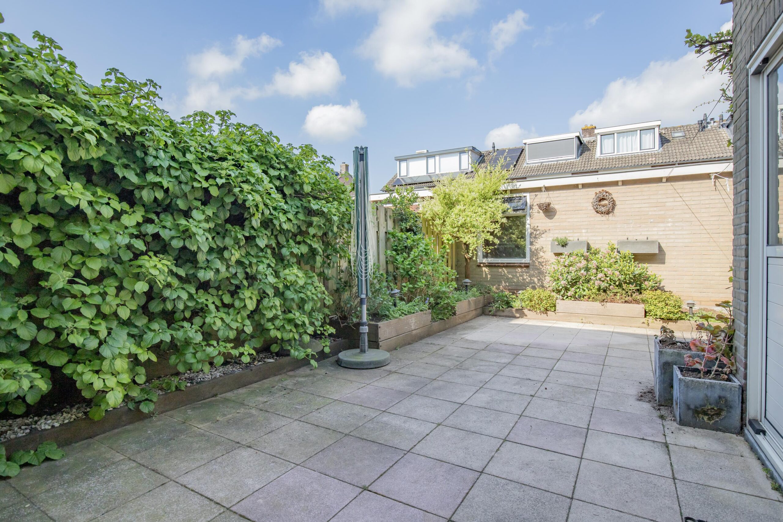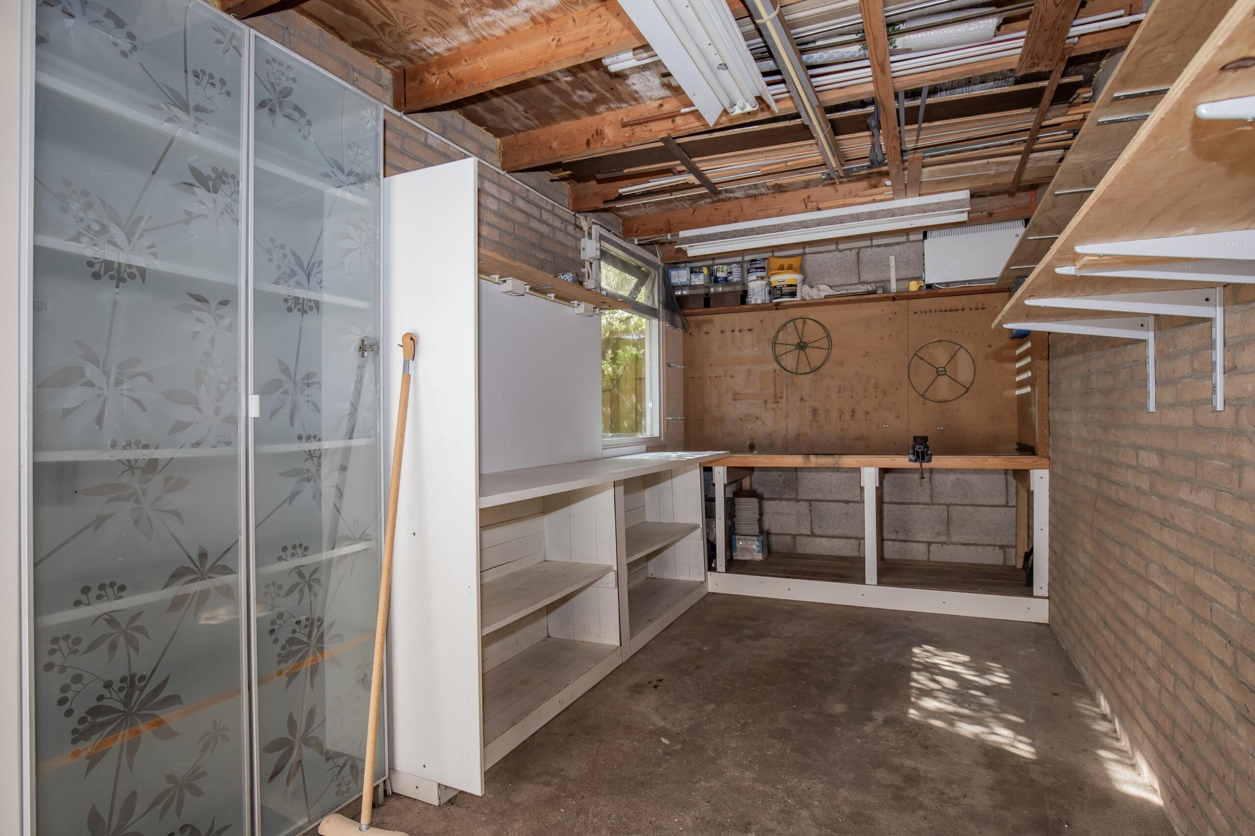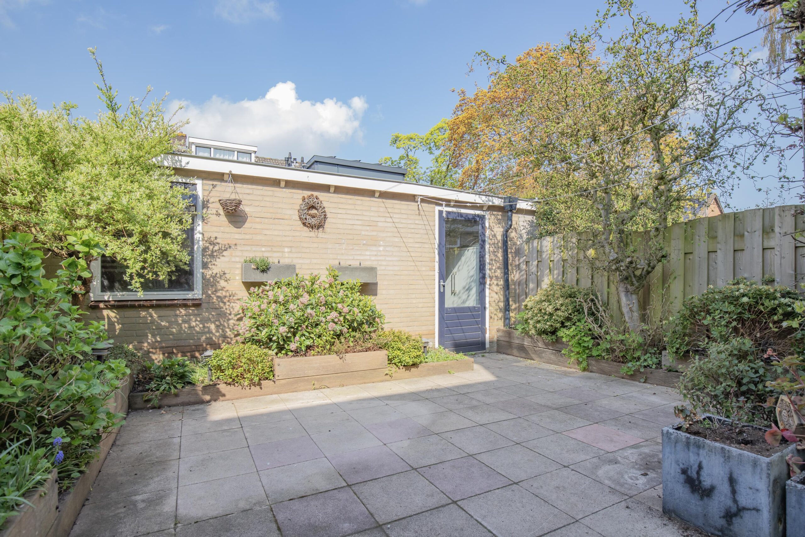 De achtertuin is onderhoudsvriendelijk aangelegd met bestrating en groene borders, een fijne plek om te ontspannen of gezellig te tafelen. De ruime, gemetselde schuur over de volle breedte biedt volop bergruimte en is voorzien van elektra. Dankzij de achterom is de tuin ook gemakkelijk bereikbaar.