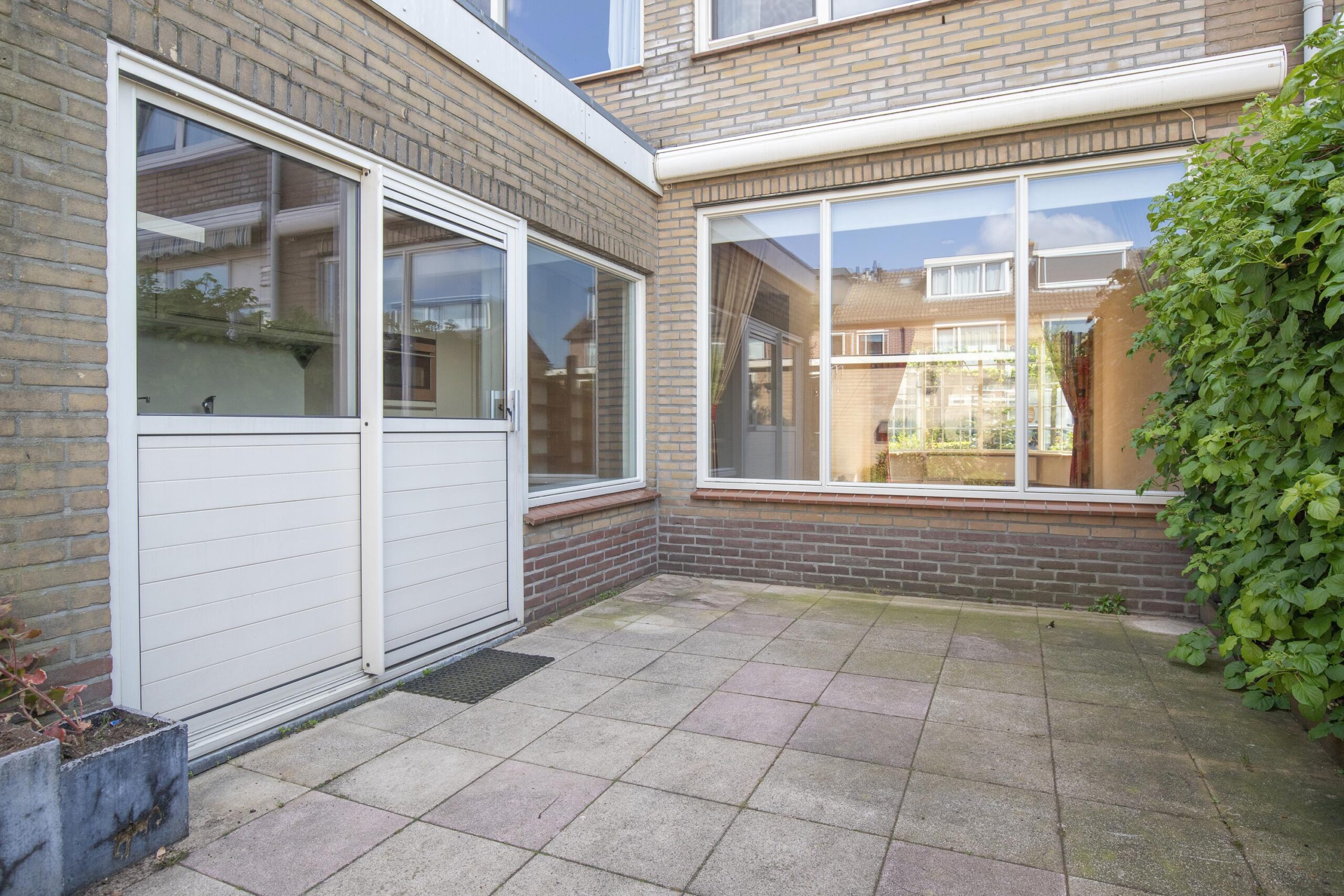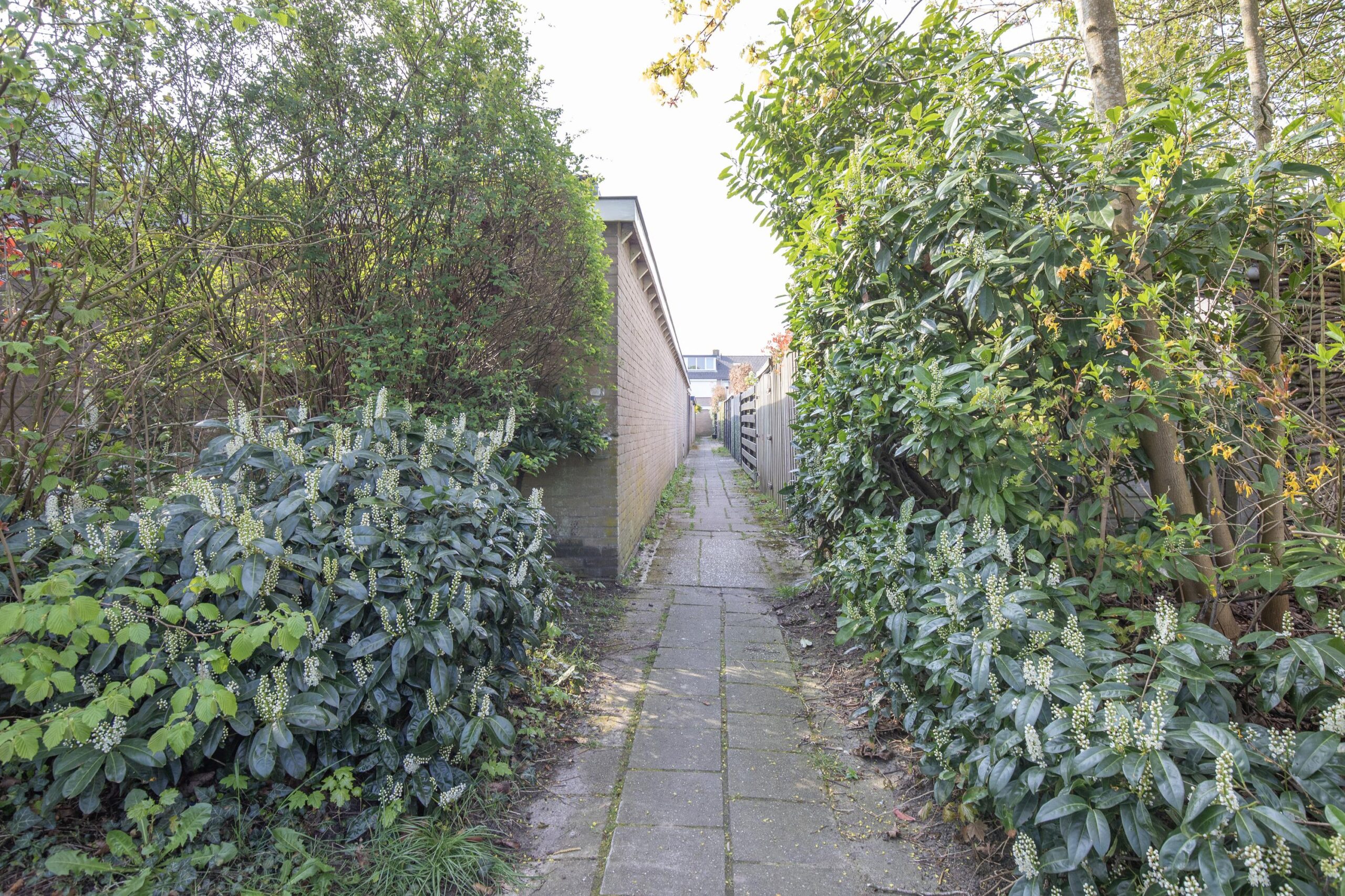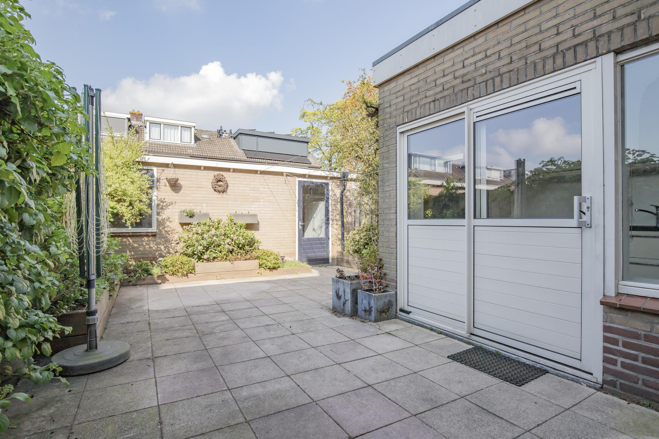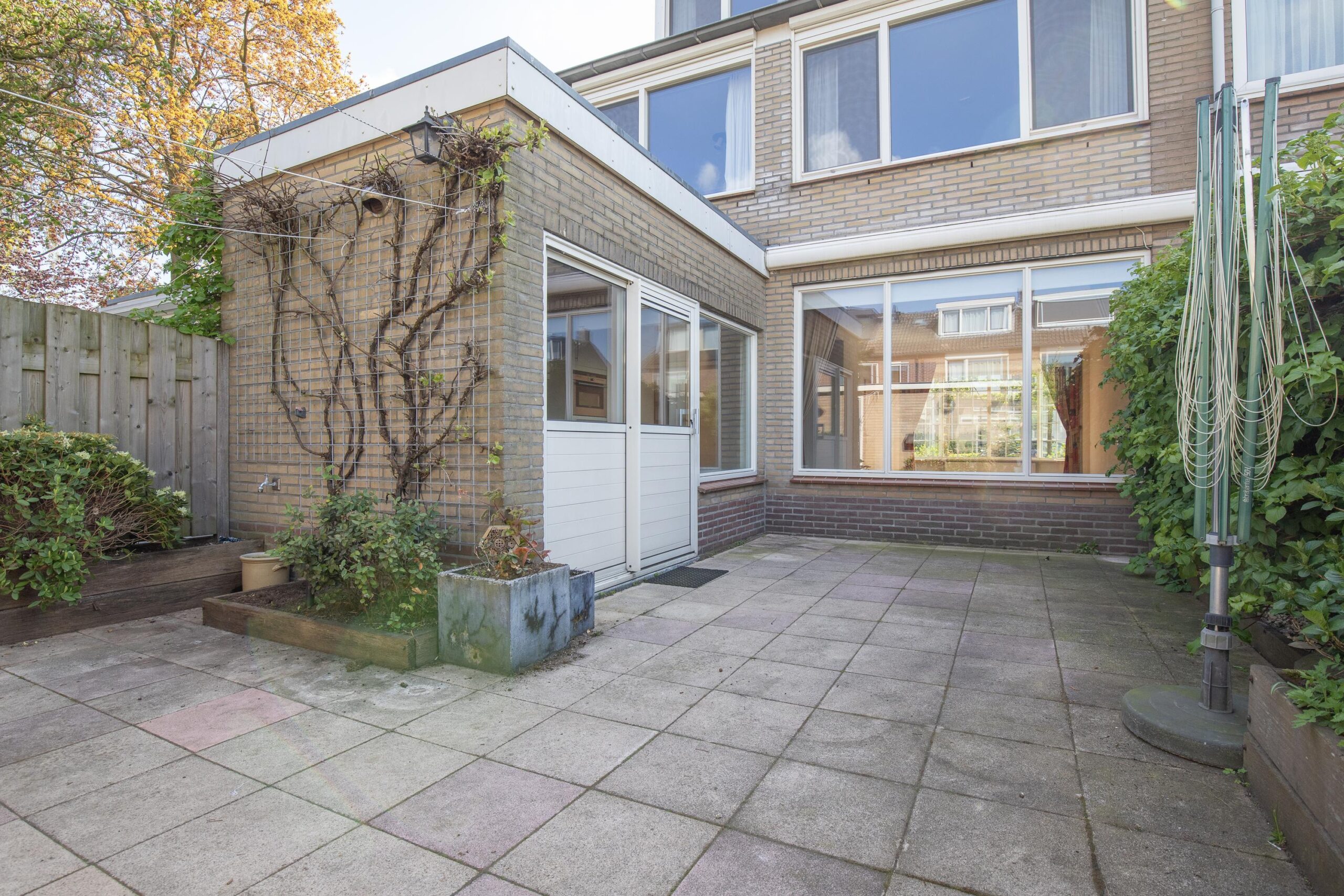De achtertuin is onderhoudsvriendelijk aangelegd met bestrating en groene borders, een fijne plek om te ontspannen of gezellig te tafelen. De ruime, gemetselde schuur over de volle breedte biedt volop bergruimte en is voorzien van elektra. Dankzij de achterom is de tuin ook gemakkelijk bereikbaar.