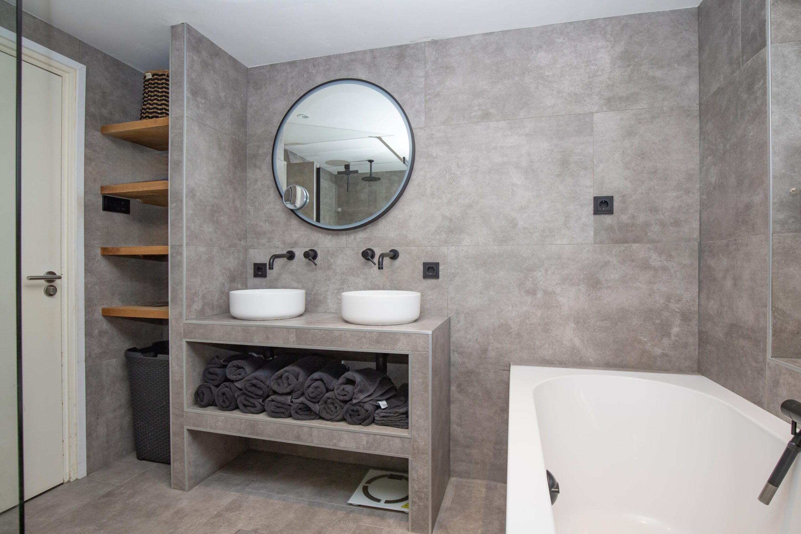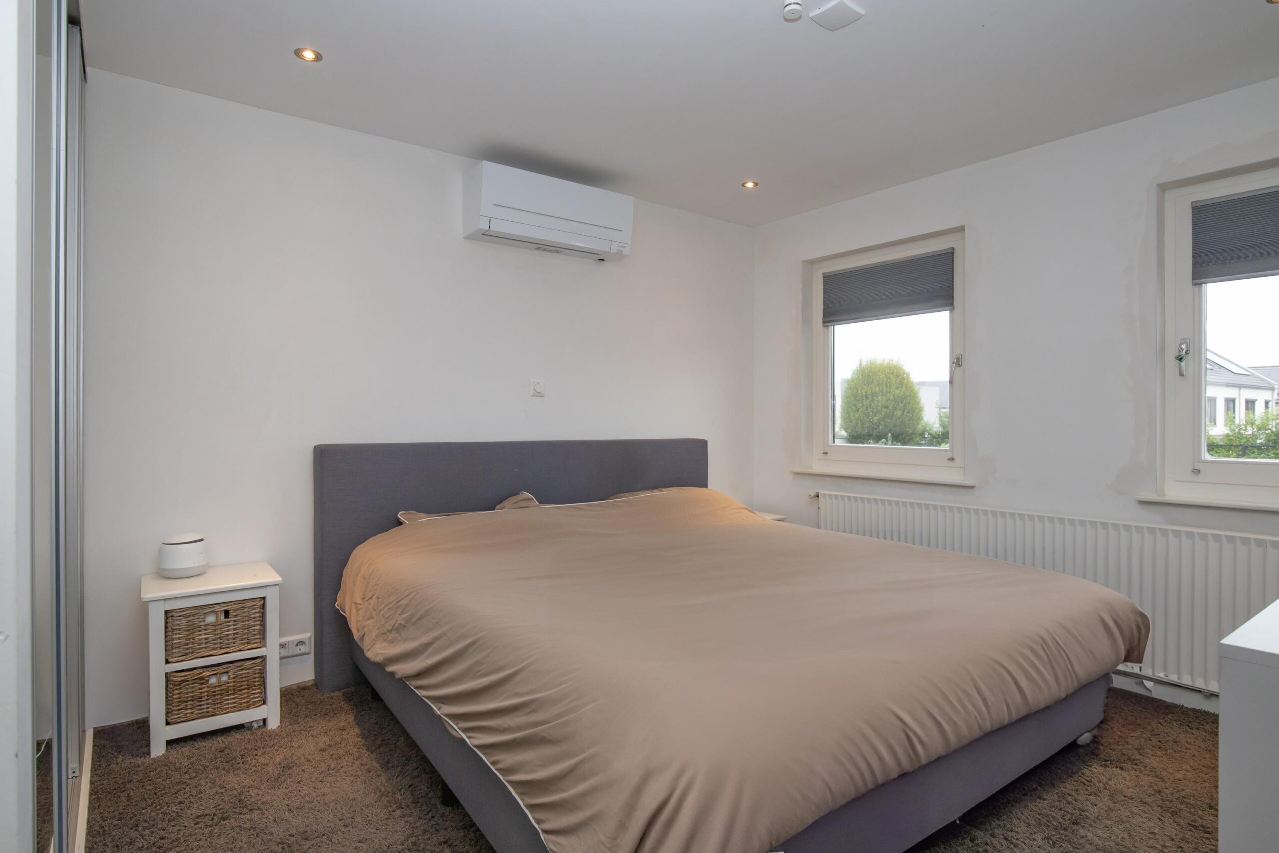 De overloop biedt toegang tot twee ruime slaapkamers, waarvan één met een vaste kastenwand. Beide kamers zijn voorzien van airconditioning voor optimaal comfort in elk seizoen. De luxe badkamer is werkelijk een plaatje: ligbad, inloopdouche, tweede toilet en een dubbele wastafel maken dit een heerlijke wellnessruimte.