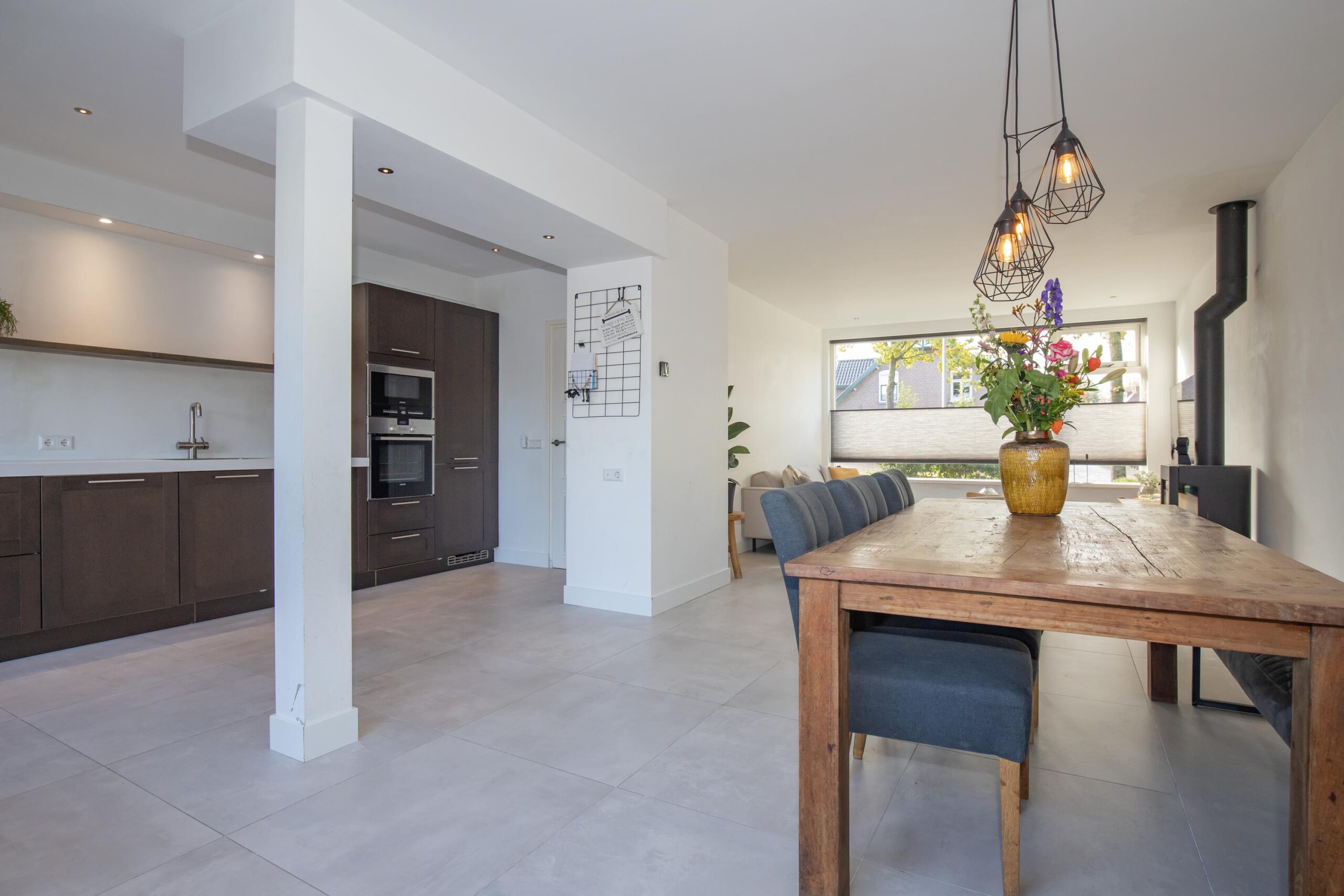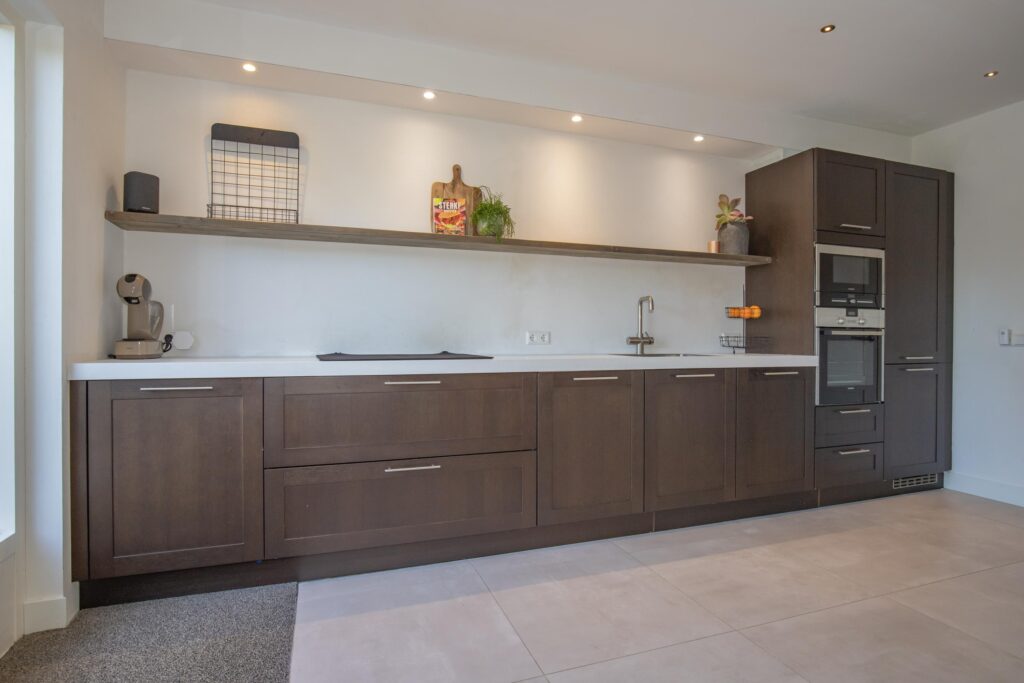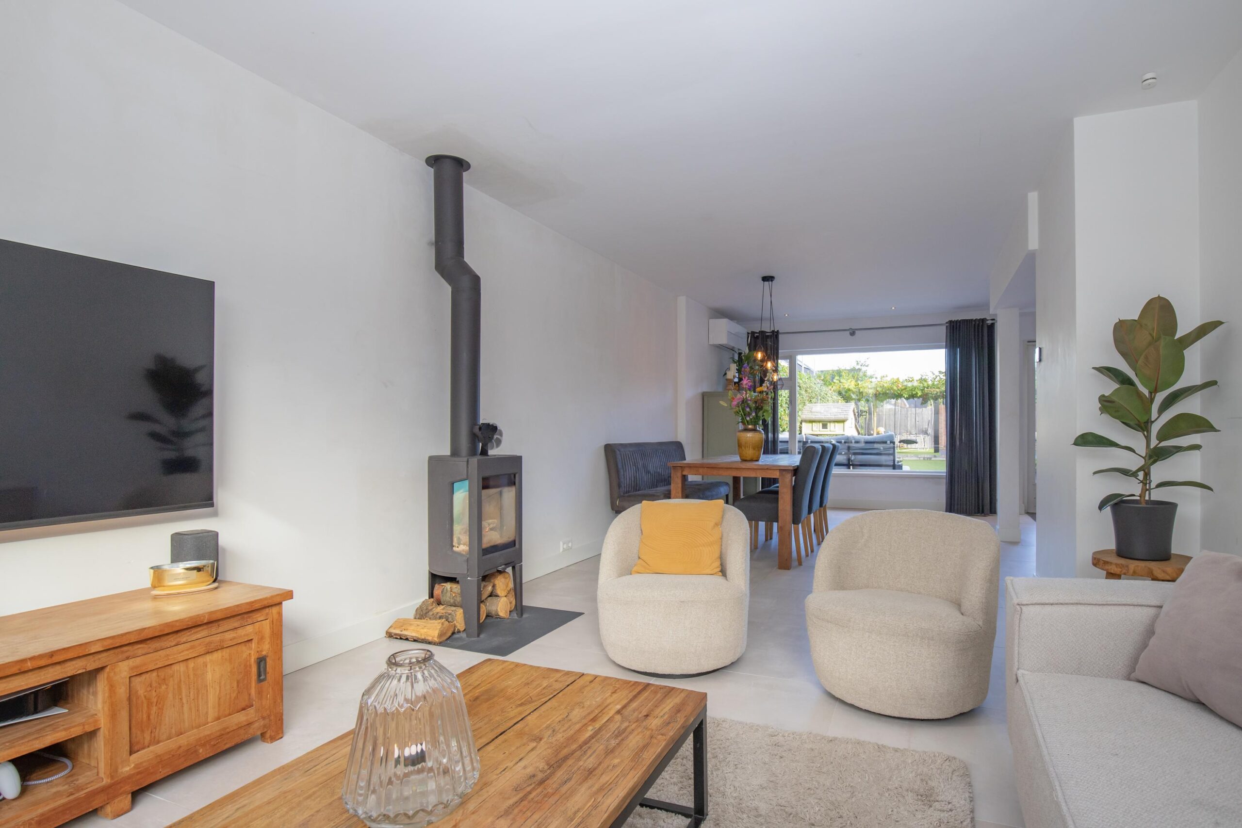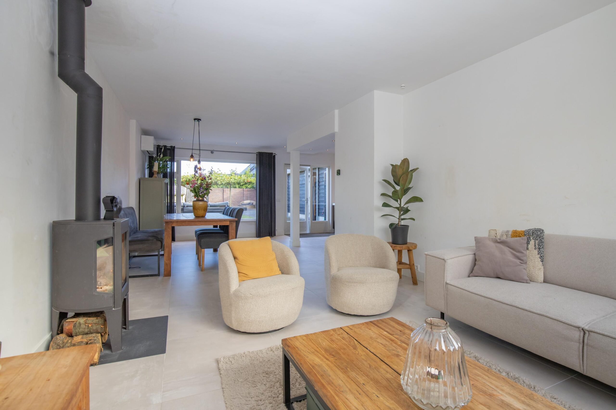 Via de hal met trapopgang en toiletruimte komt u in de sfeervolle woonkamer aan de voorzijde. Grote raampartijen zorgen voor een prachtige lichtinval, terwijl de houtkachel direct zorgt voor een warme, huiselijke sfeer. De tuingerichte woonkeuken vormt het hart van het huis: een moderne rechte opstelling met veel werkruimte, lades, inbouwapparatuur en plek voor een royale eettafel. Hier kookt u met plezier en dineert u met uitzicht op de tuin.