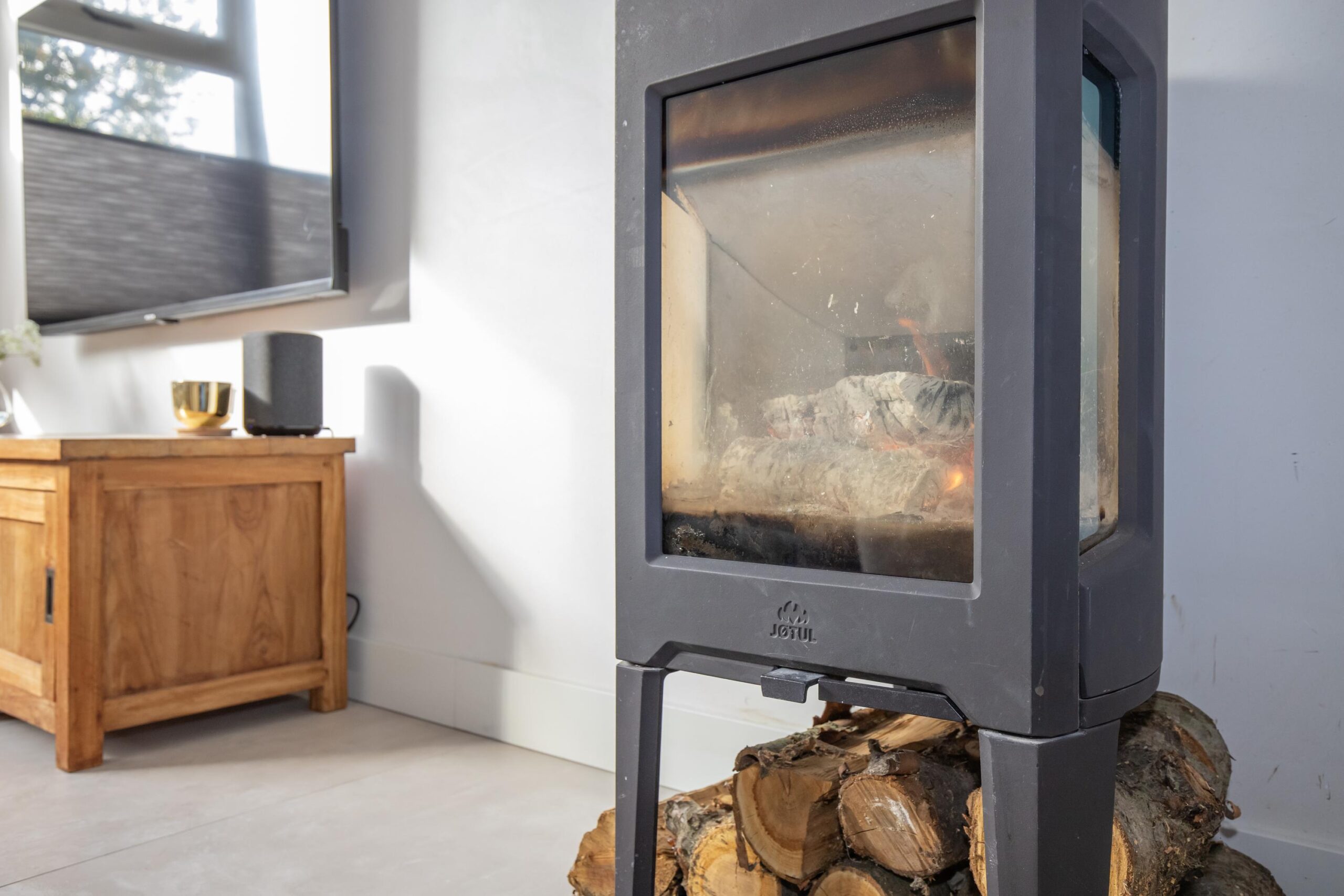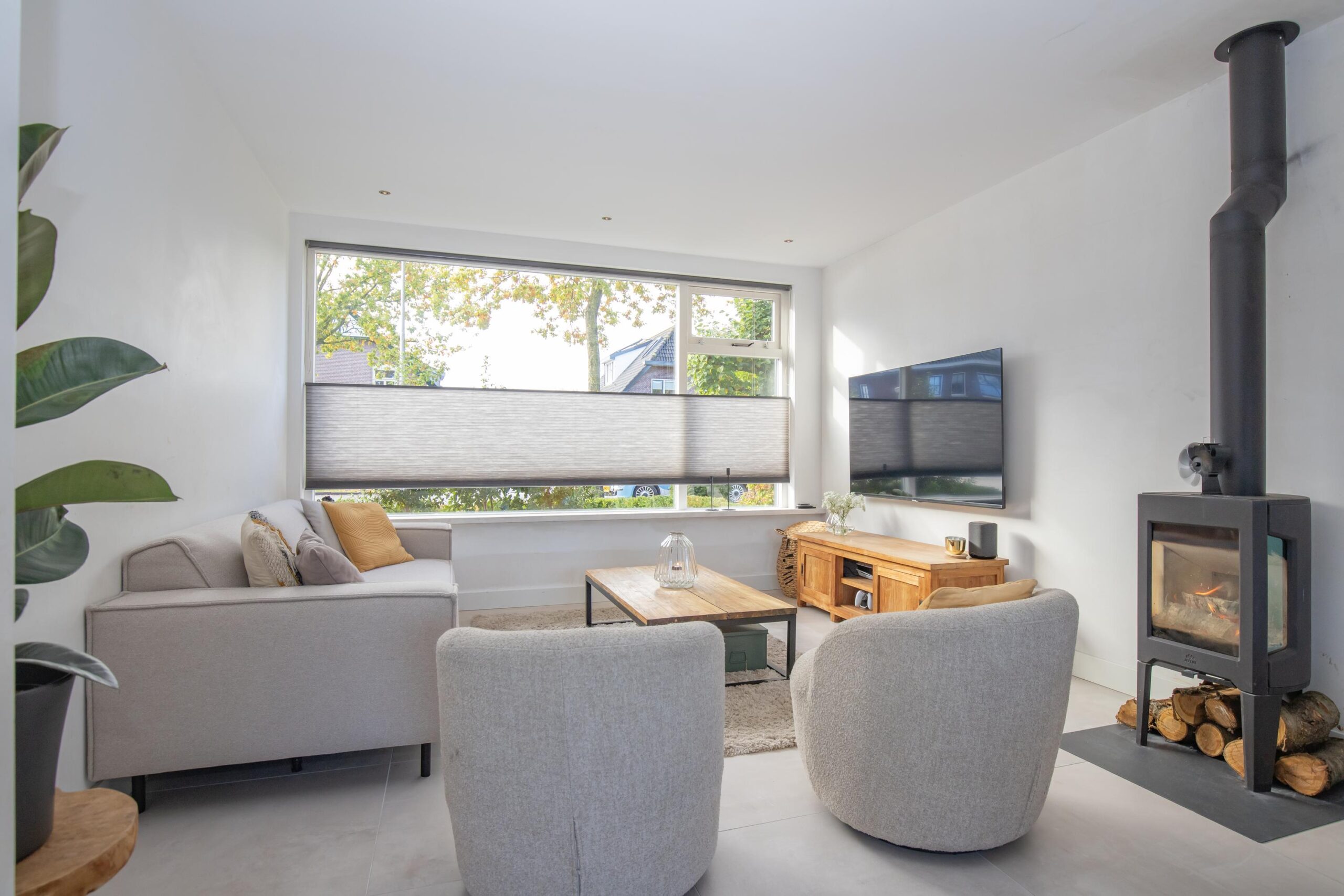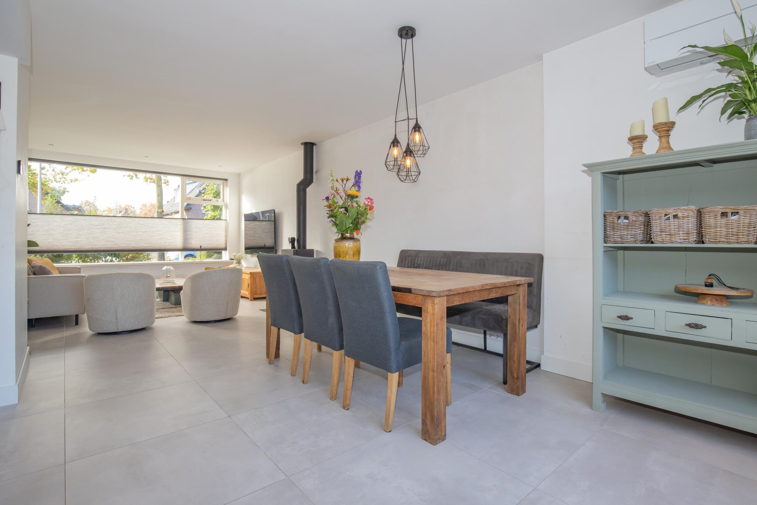 Via de hal met trapopgang en toiletruimte komt u in de sfeervolle woonkamer aan de voorzijde. Grote raampartijen zorgen voor een prachtige lichtinval, terwijl de houtkachel direct zorgt voor een warme, huiselijke sfeer. De tuingerichte woonkeuken vormt het hart van het huis: een moderne rechte opstelling met veel werkruimte, lades, inbouwapparatuur en plek voor een royale eettafel. Hier kookt u met plezier en dineert u met uitzicht op de tuin.