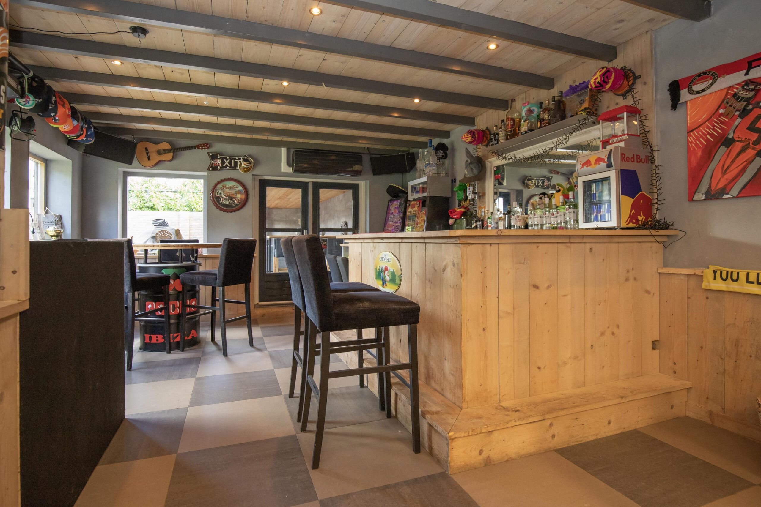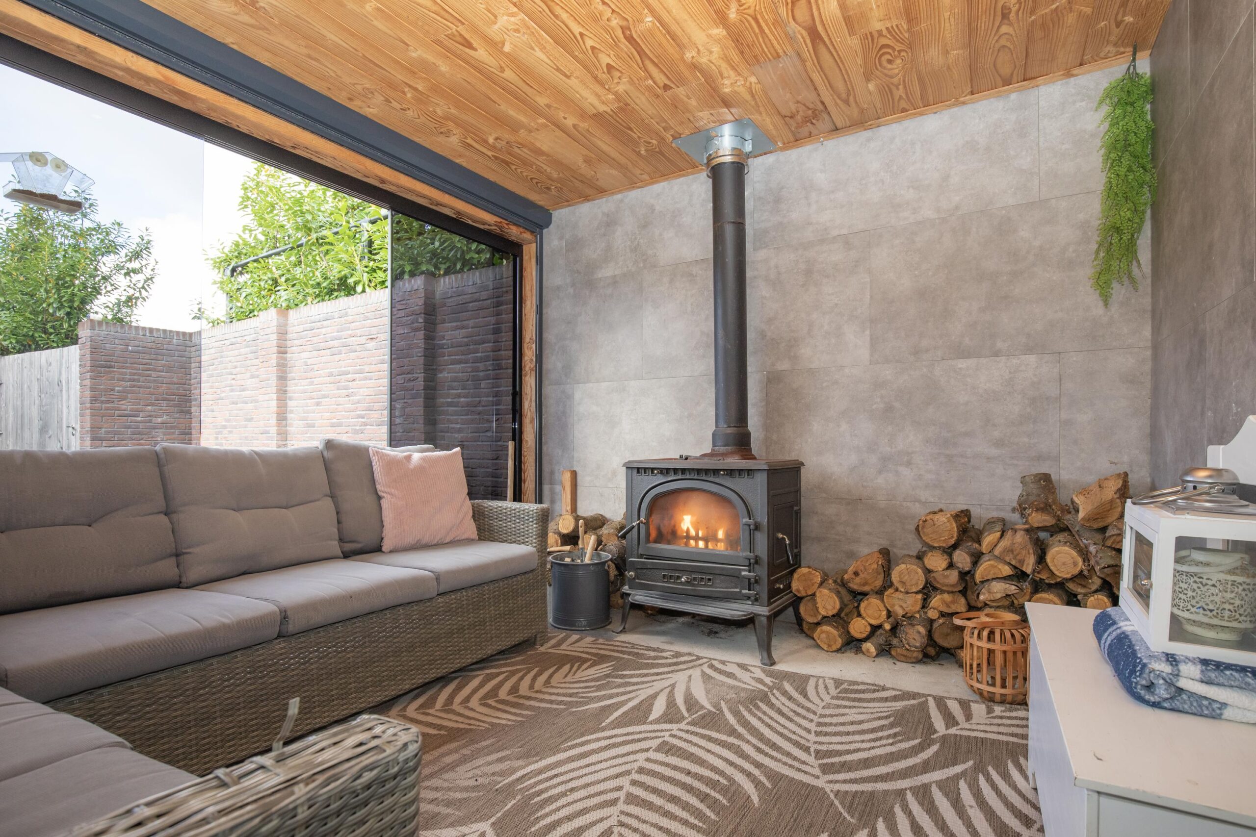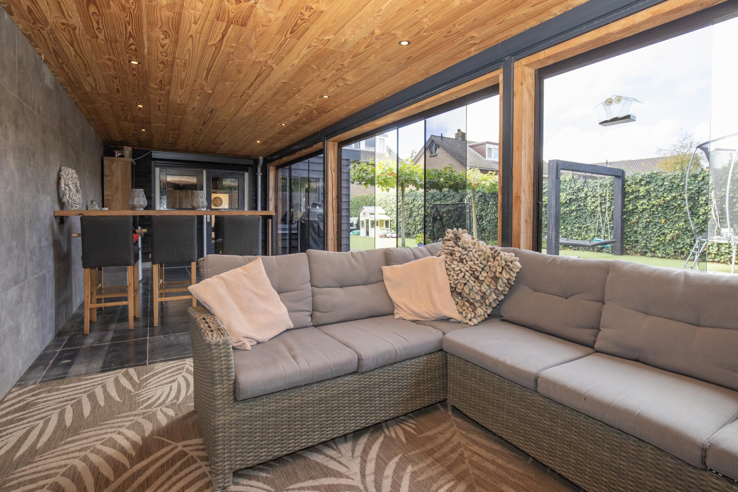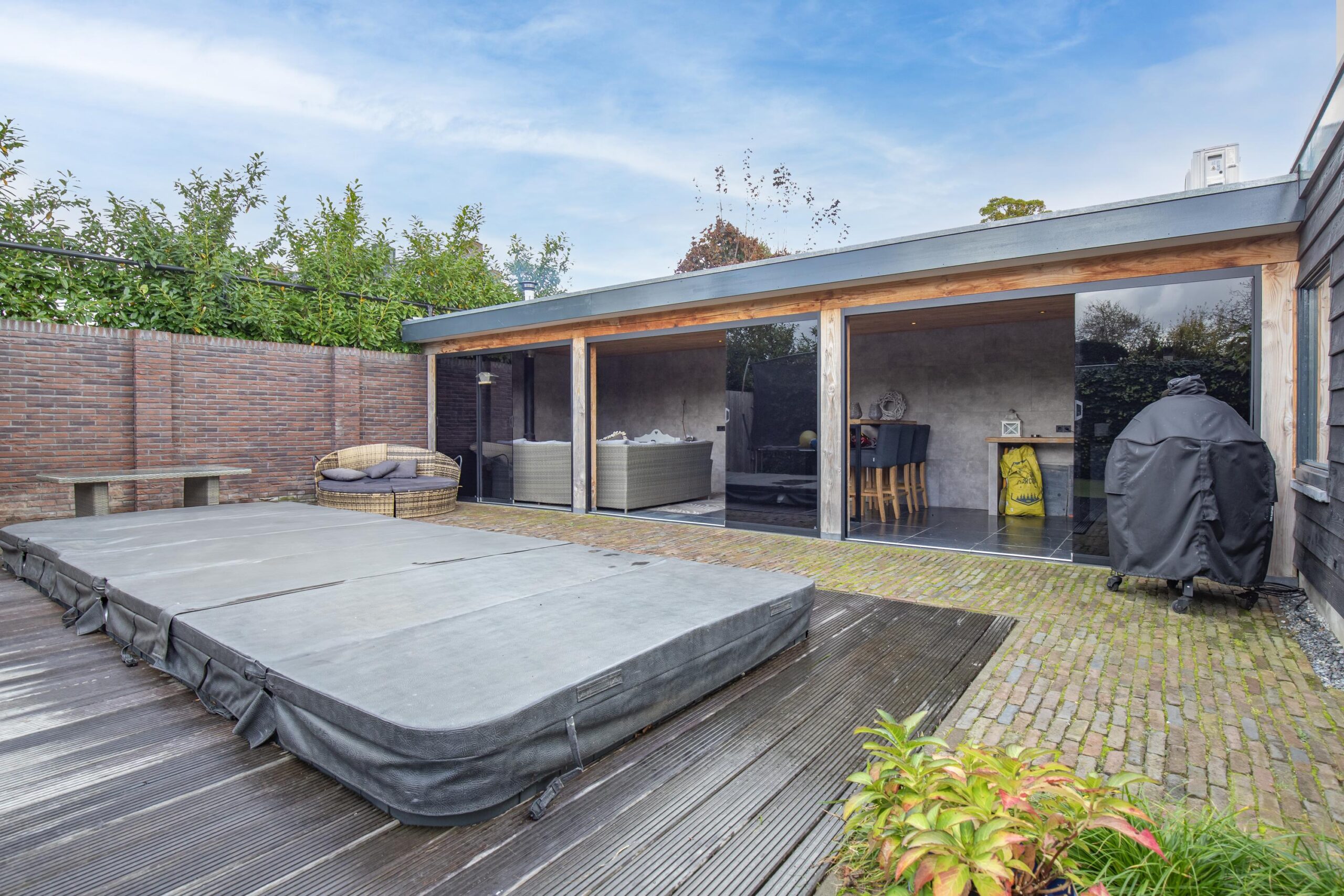 De buitenruimte is een droom voor iedereen die houdt van ontspanning en gezelligheid. Naast de garage vindt u twee volledig geïsoleerde bijgebouwen, momenteel ingericht als sportruimte en ontspanningsruimte met bar. En alsof dat nog niet genoeg is, is er ook een sfeervolle, met glas afsluitbare serre/veranda met houtkachel — de perfecte plek voor het hele jaar door genieten! Aan de achterkant van de tuin is een extra poort met een brede poort die over de gehele breedte open kan.