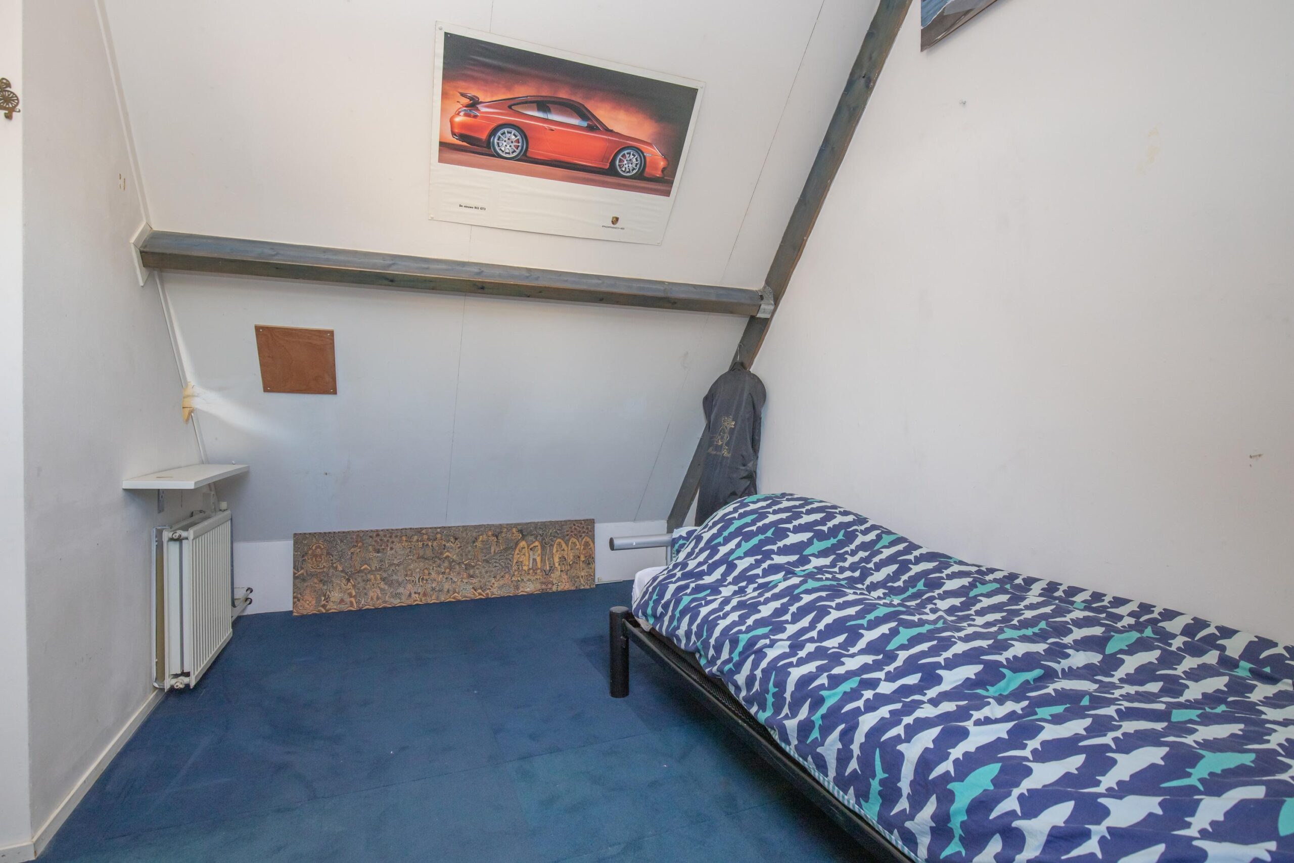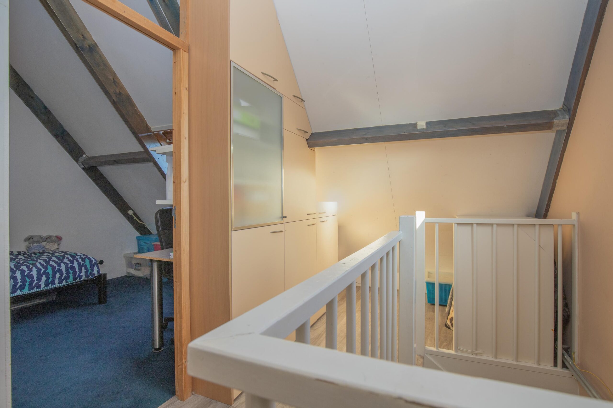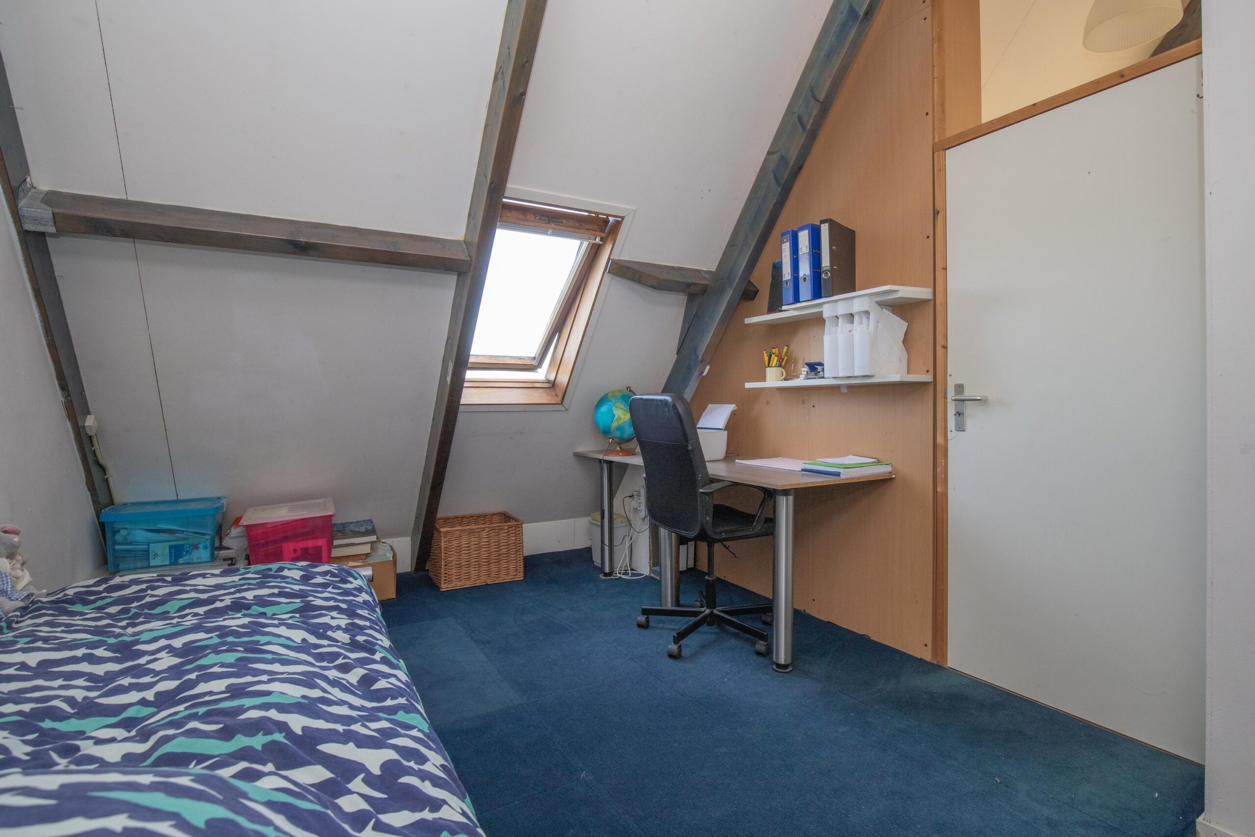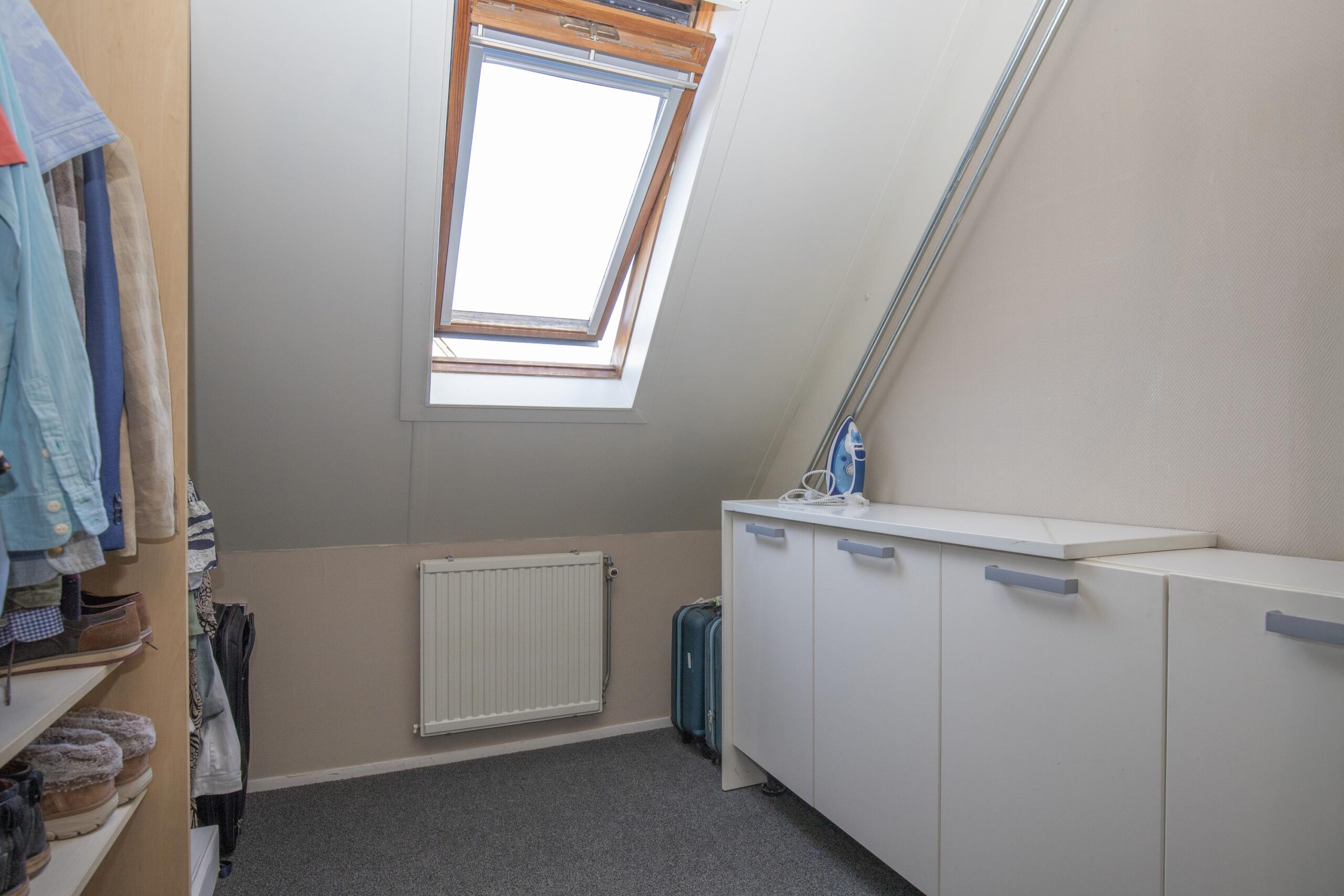 De zolderverdieping biedt verrassend veel ruimte! De lichte overloop met gestucte muren en wasmachineaansluiting leidt naar een royale vierde slaapkamer met dakraam, Een ideale plek als werkruimte, logeerkamer of hobbyruimte.