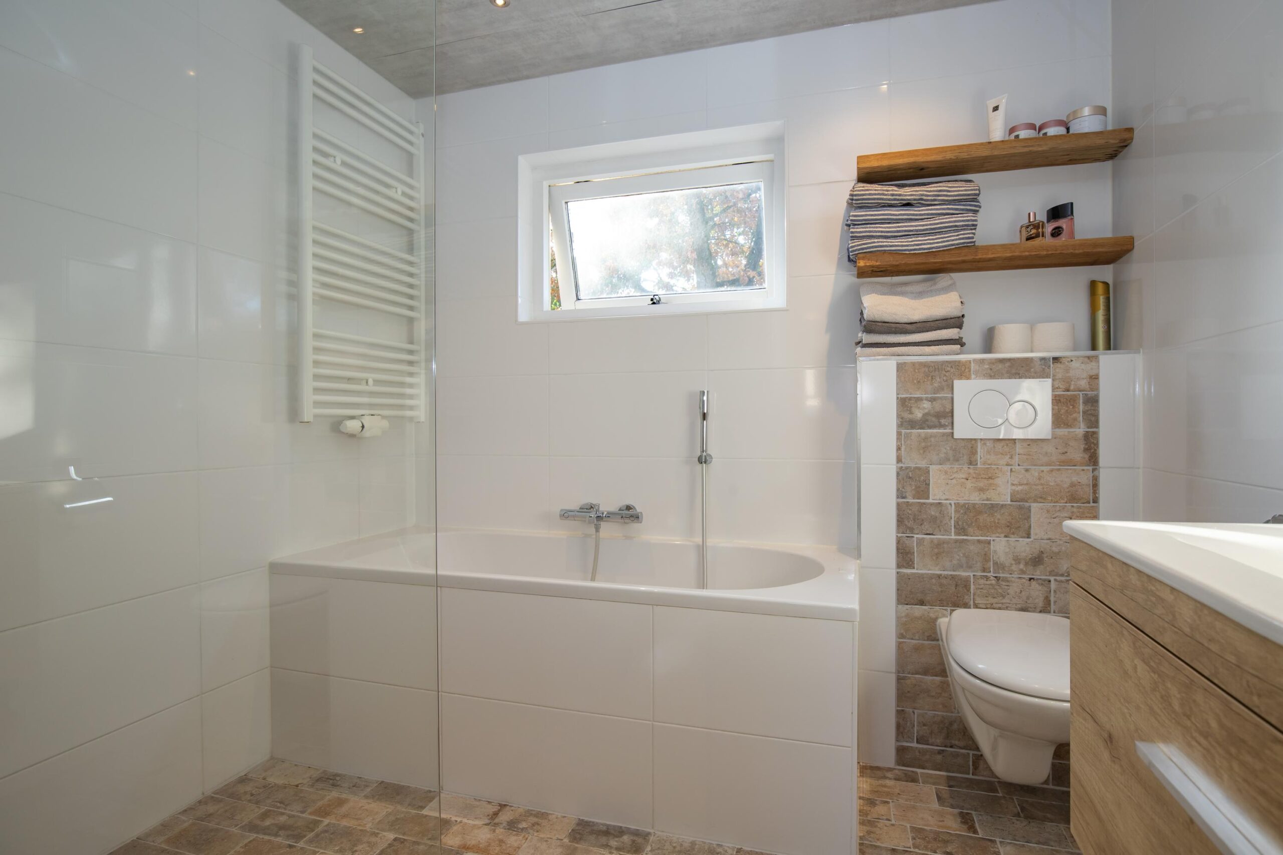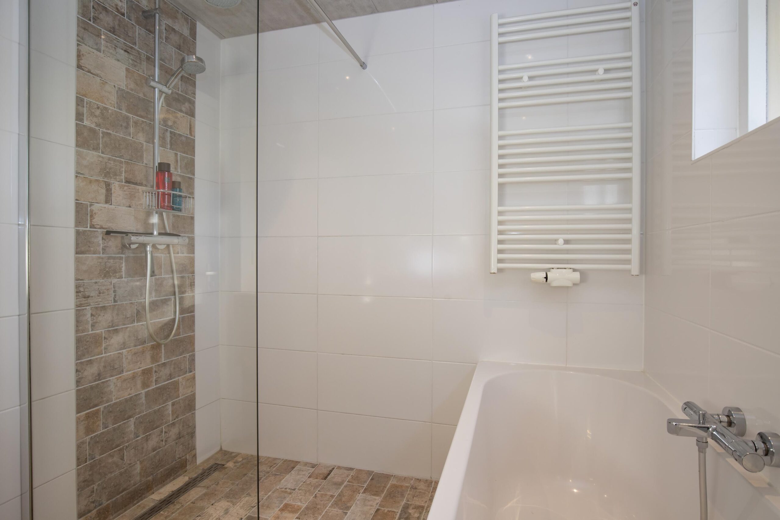 Op de eerste verdieping ligt een donkere, comfortabele vloerbedekking die doorloopt in de slaapkamers. Aan de achterzijde bevinden zich twee slaapkamers, waaronder de master bedroom met een klapraam en een stijlvolle muurafwerking met een stenenprintbehang. De tweede slaapkamer aan de achterzijde is eveneens sfeervol ingericht. Aan de voorzijde ligt een derde slaapkamer met strak gestukte witte muren — ideaal als kinderkamer, werkkamer of logeerkamer. De badkamer is modern en licht uitgevoerd met een combinatie van witte wandtegels en lichte vloertegels. Hier vind je een wastafelmeubel, hangtoilet, bad, inloopdouche en een designradiator — alles voor optimaal comfort.