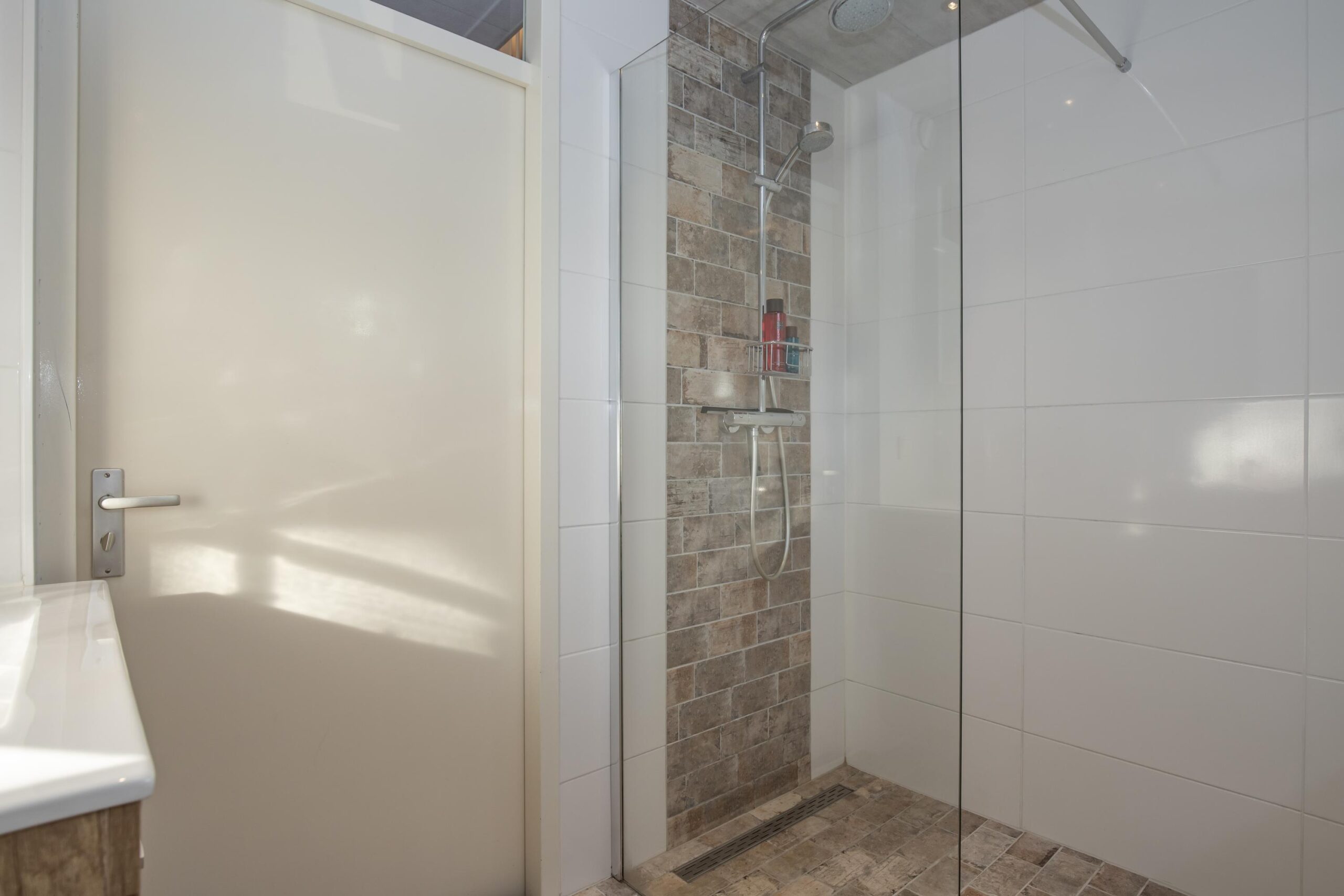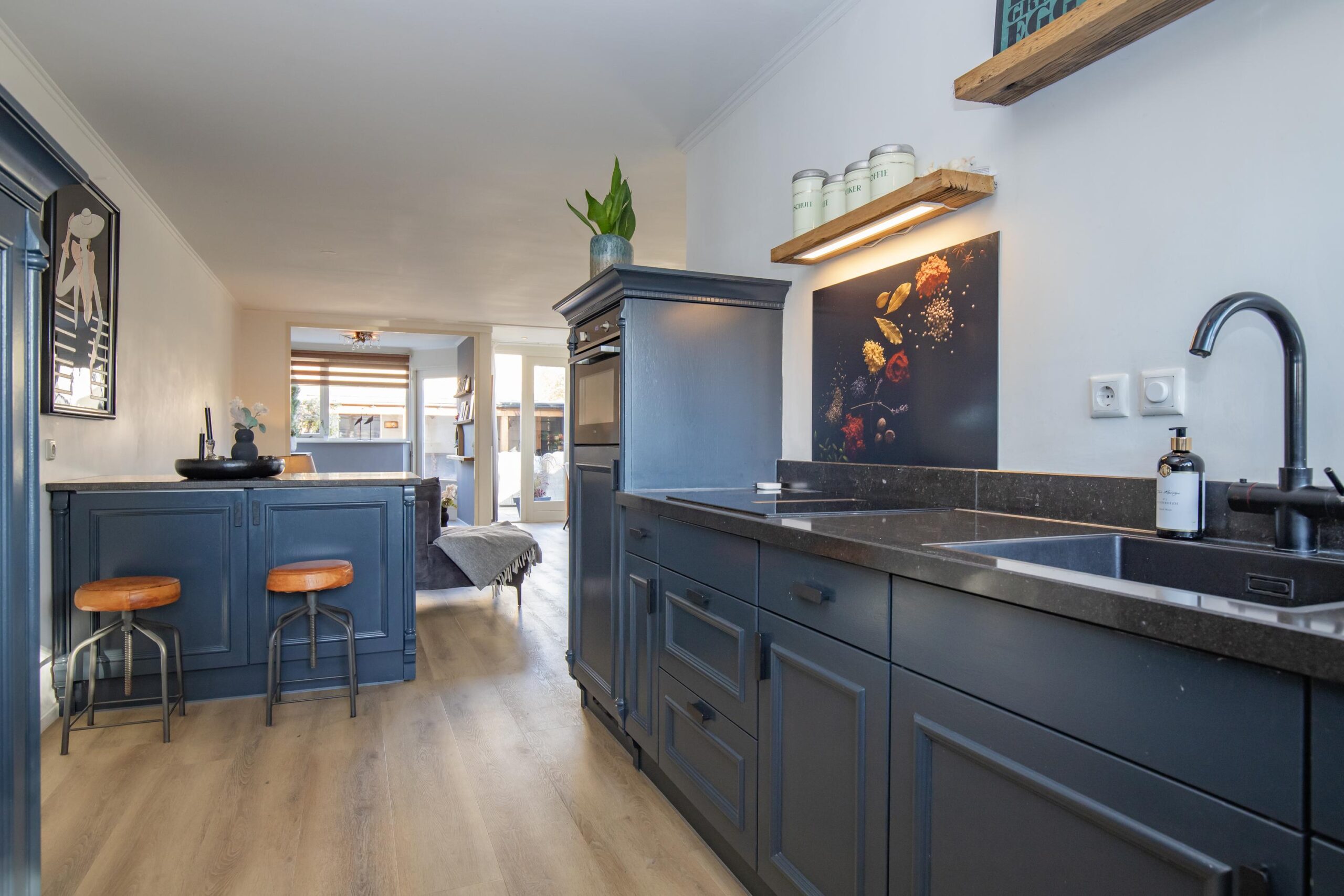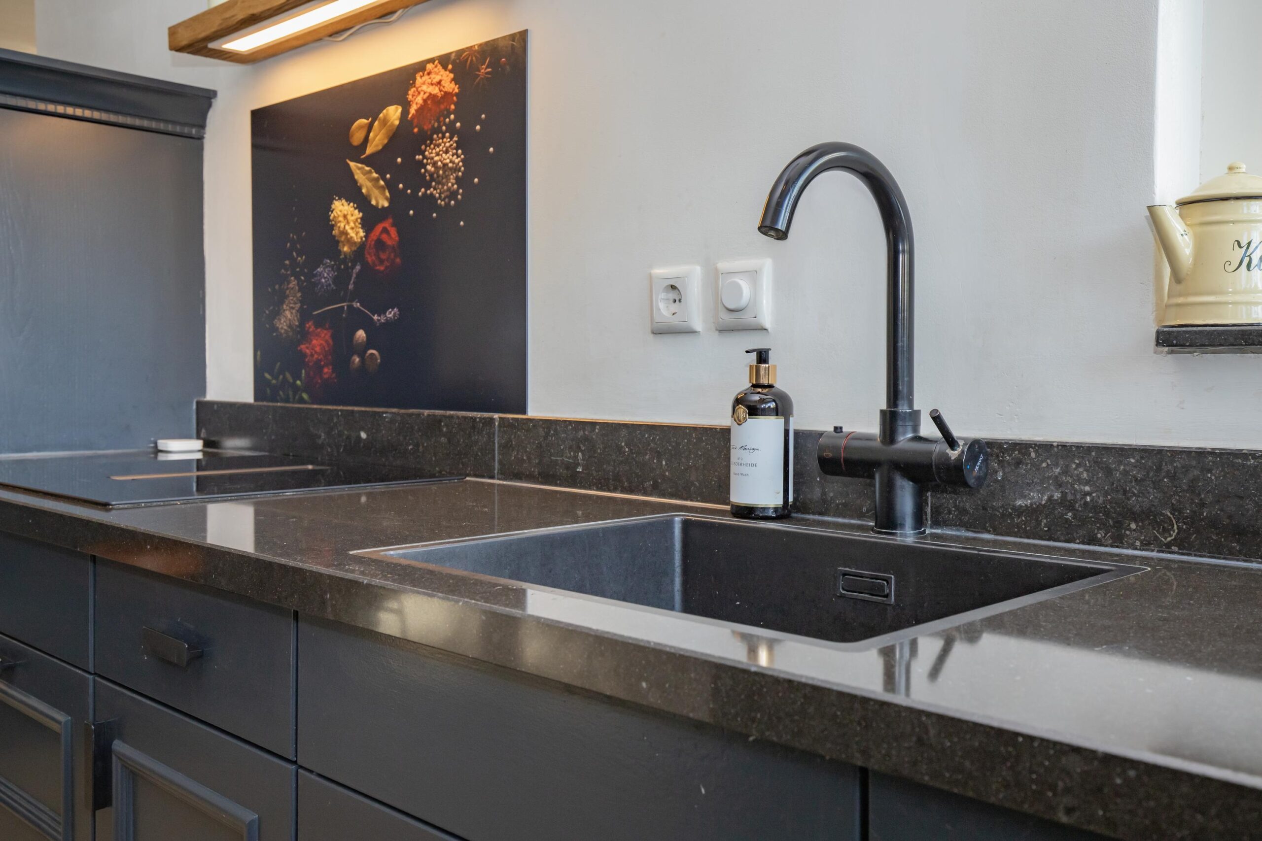 De open keuken heeft een moderne rechte opstelling en is volledig uitgerust met een combi-oven, vaatwasser, koelkast, Quooker en een 4-pits inductiekookplaat met geïntegreerde afzuiging. Het gezellige eiland met barkrukken nodigt uit tot lange gesprekken of een snel ontbijt in de ochtendzon.