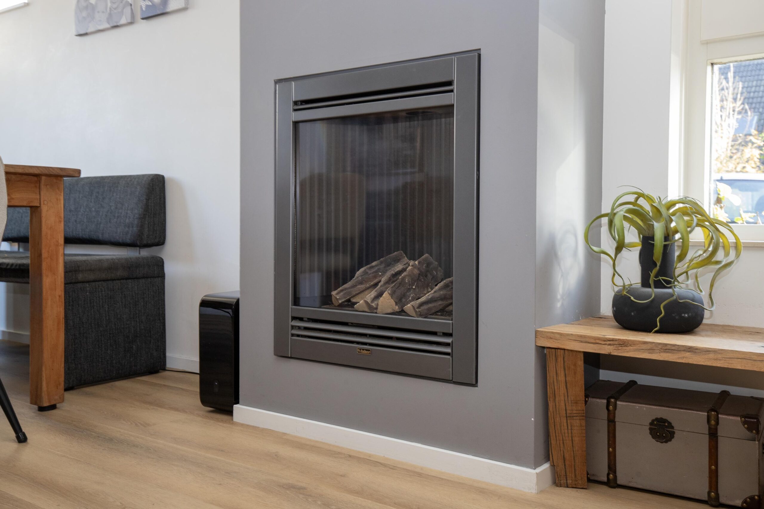 De woonkamer is een oase van licht dankzij het mooie raamwerk en de lichte PVC-vloer met vloerverwarming die tevens dienstdoet als hoofdverwarming. De gashaard vormt het warme middelpunt van deze sfeervolle leefruimte — perfect voor gezellige avonden. De strak gestukte witte muren versterken het gevoel van ruimte en rust.