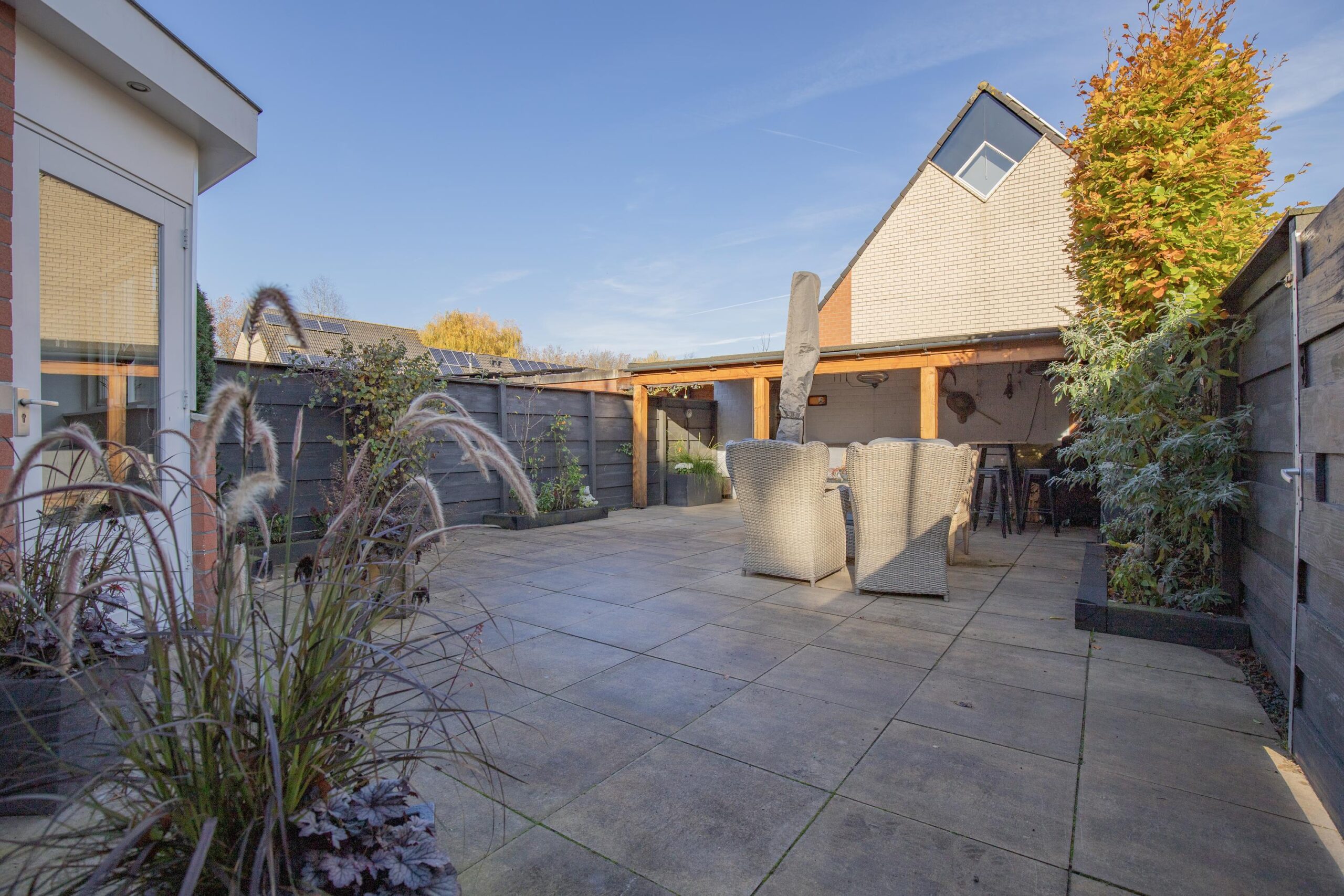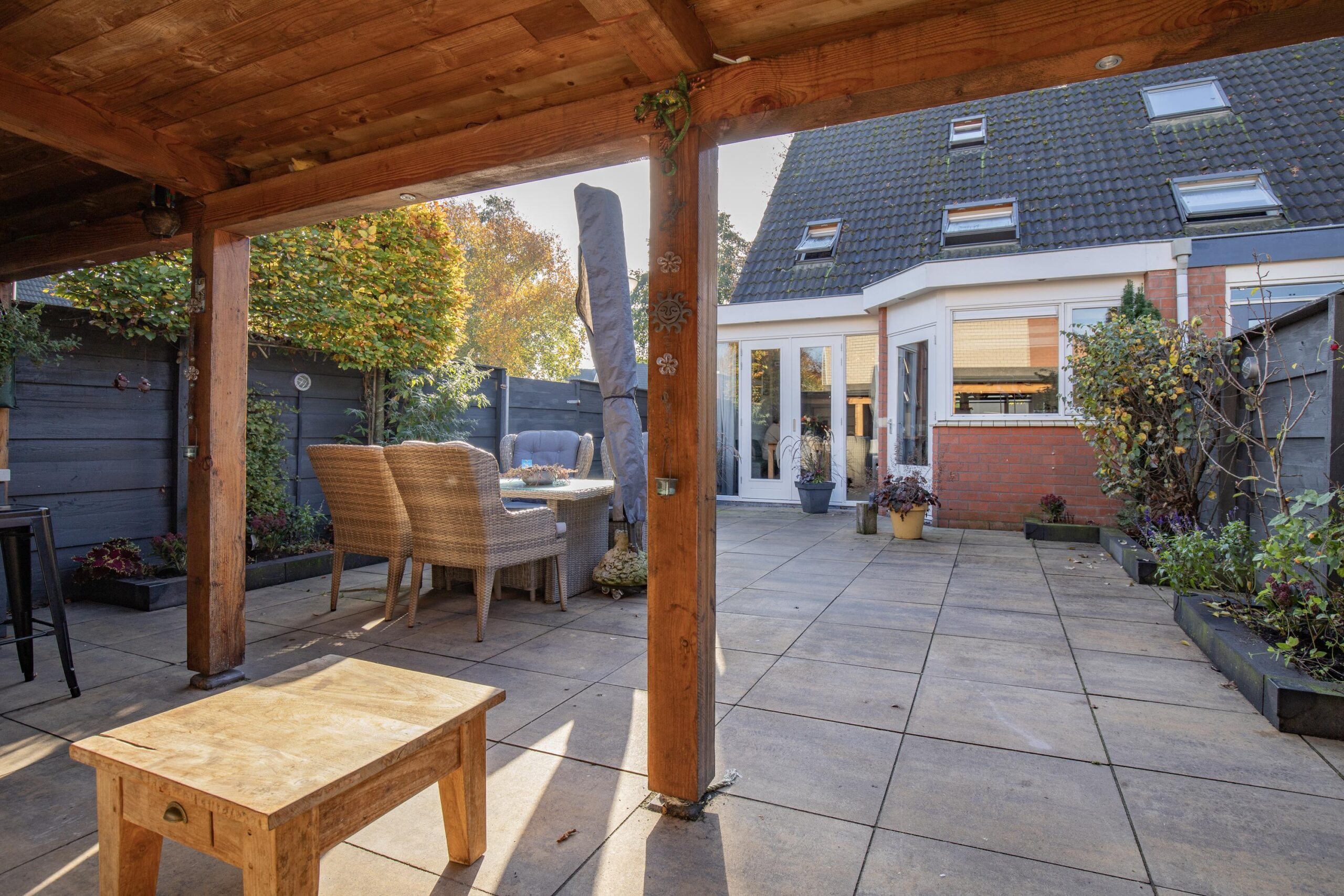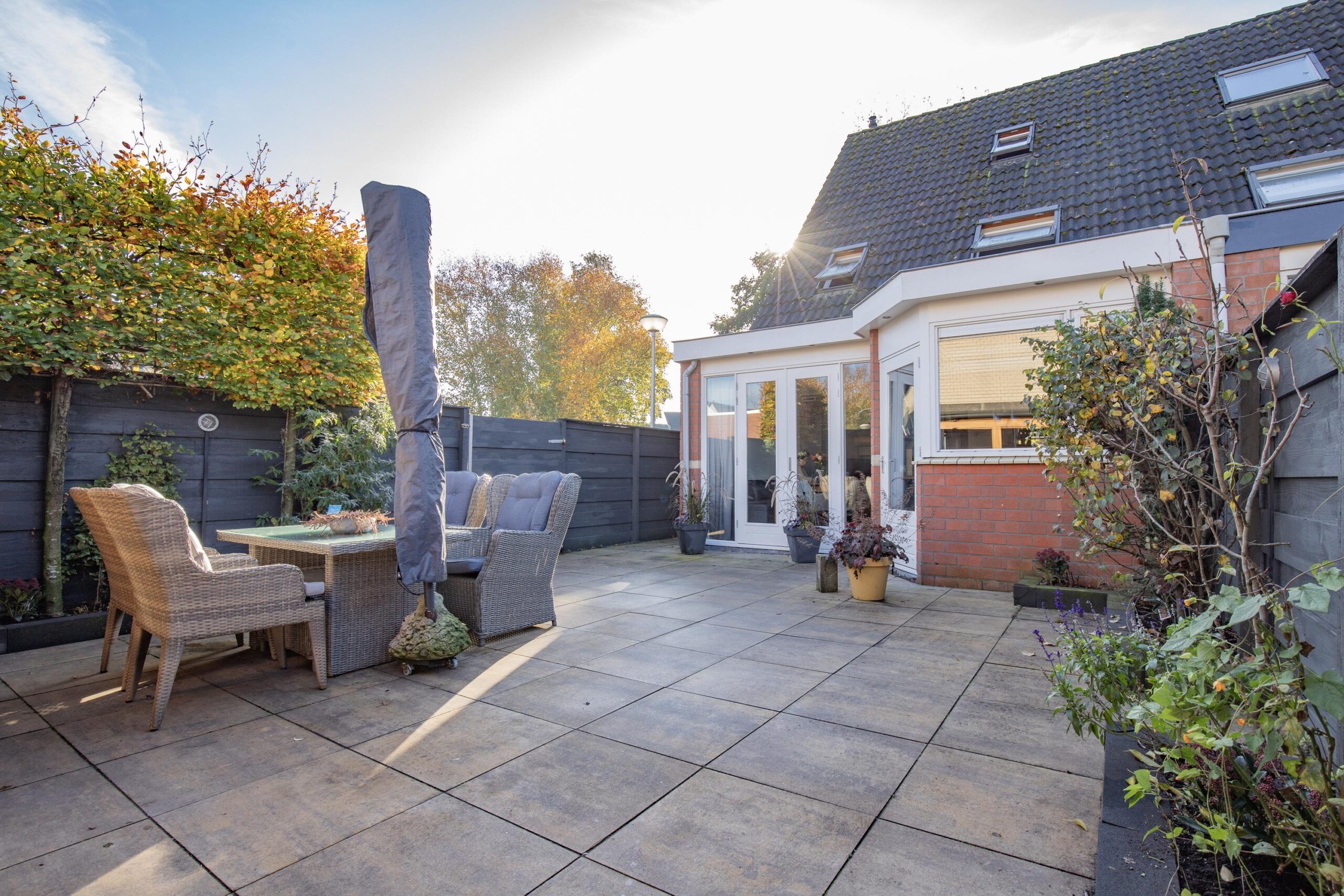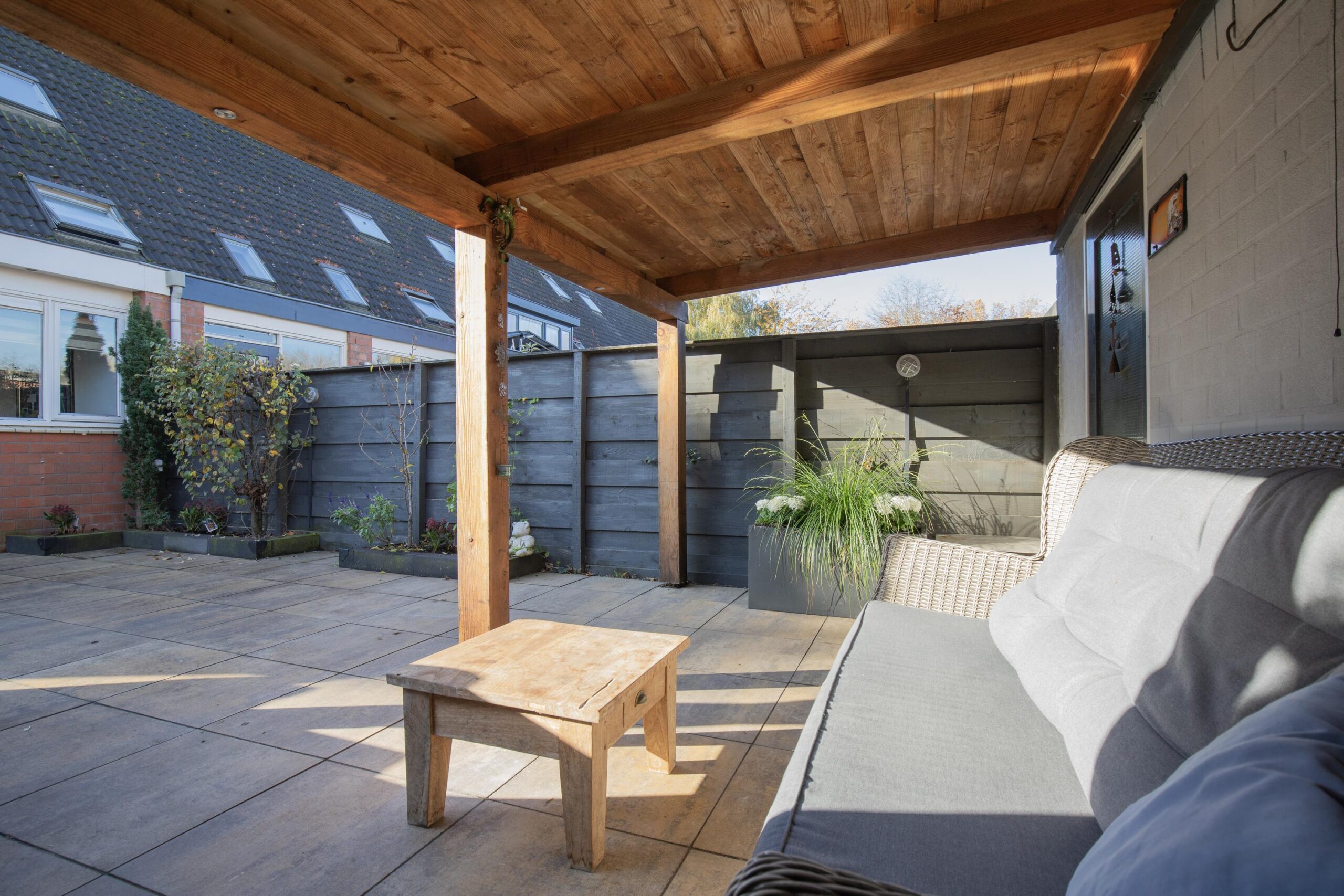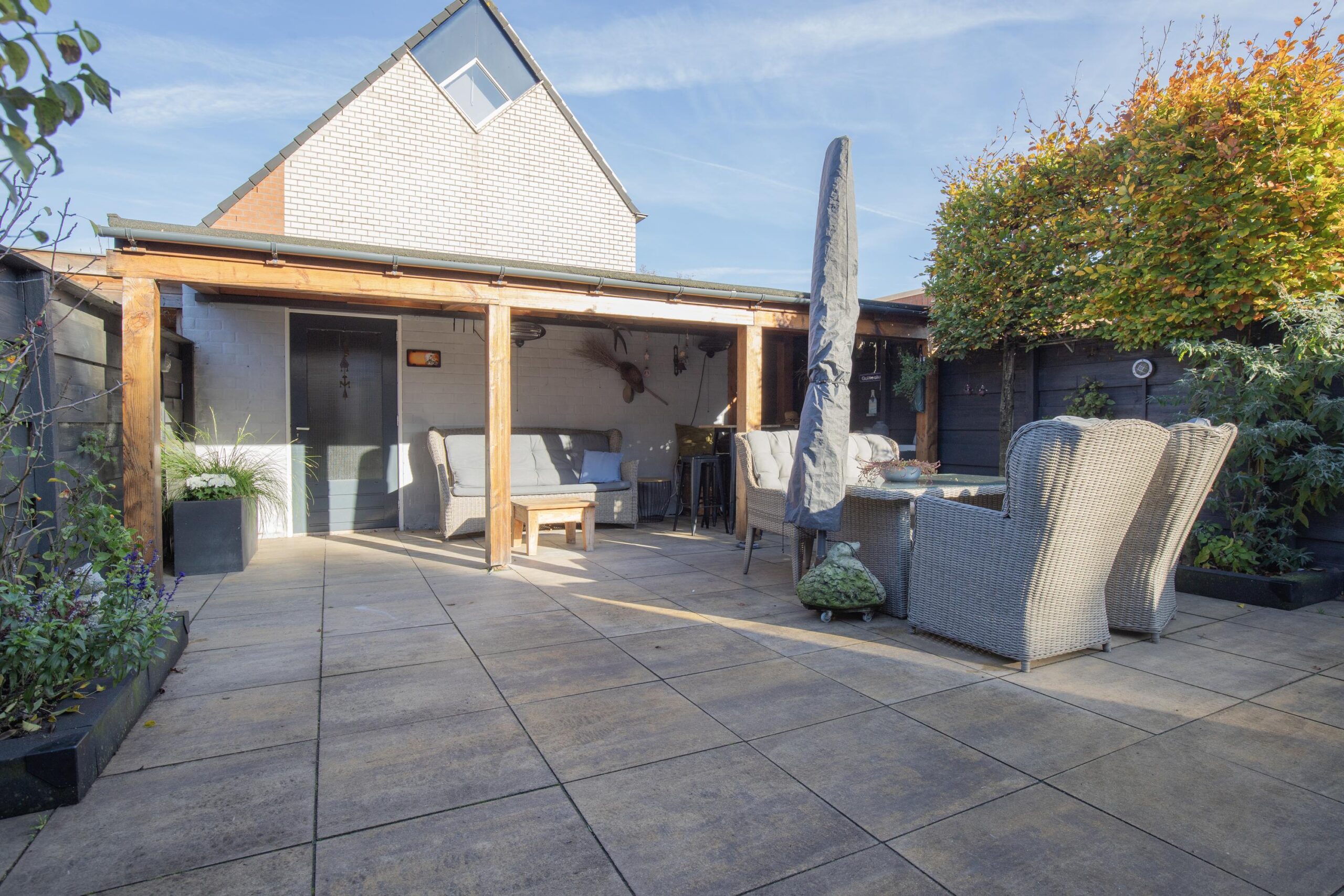 De achtertuin is onderhoudsvriendelijk aangelegd met een betegeld terras en een groene border. Achterin bevindt zich een veranda waar je het hele jaar door kunt genieten van het buitenleven. De schuur/garage is voorzien van elektriciteit en een praktische betonnen vloer.