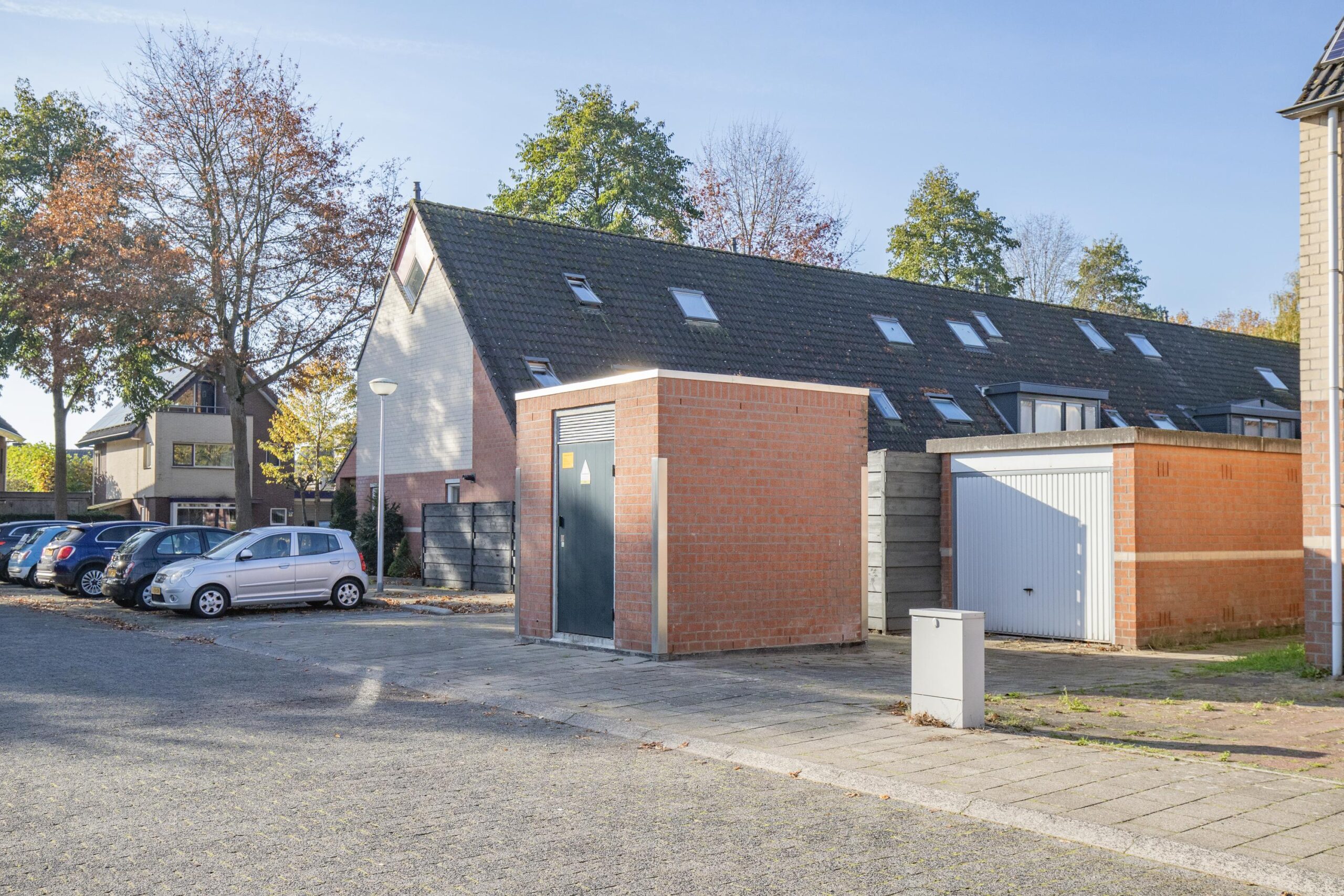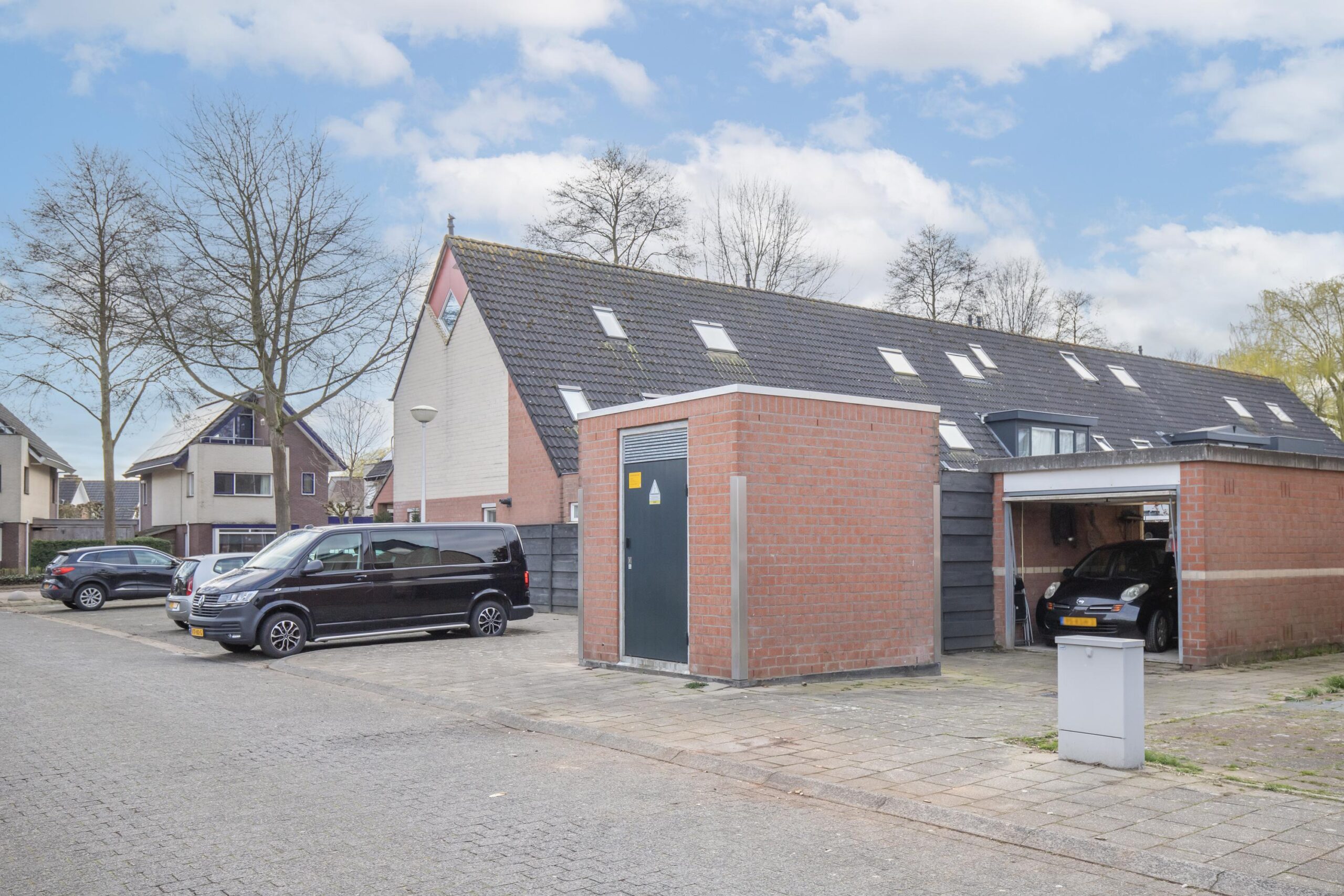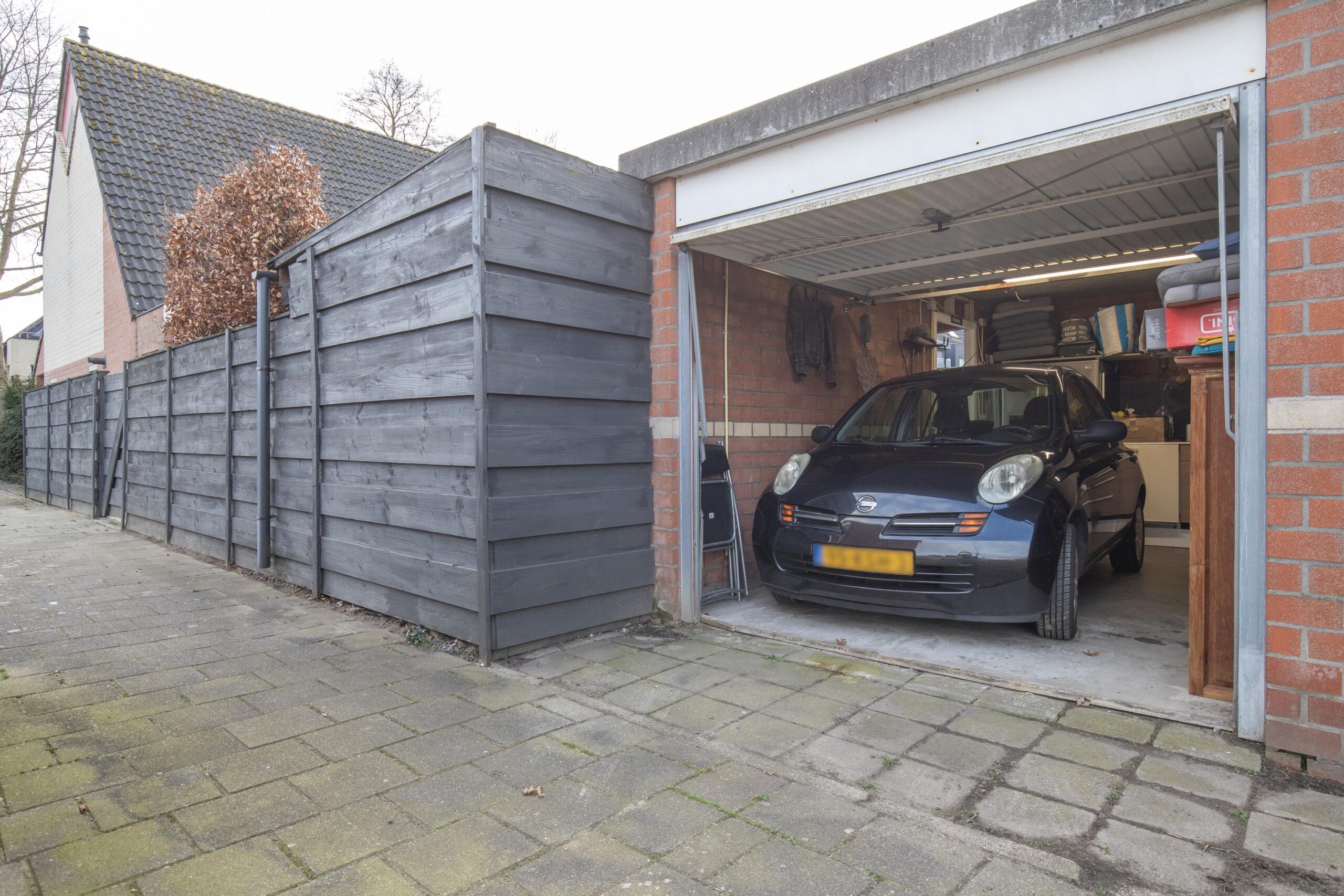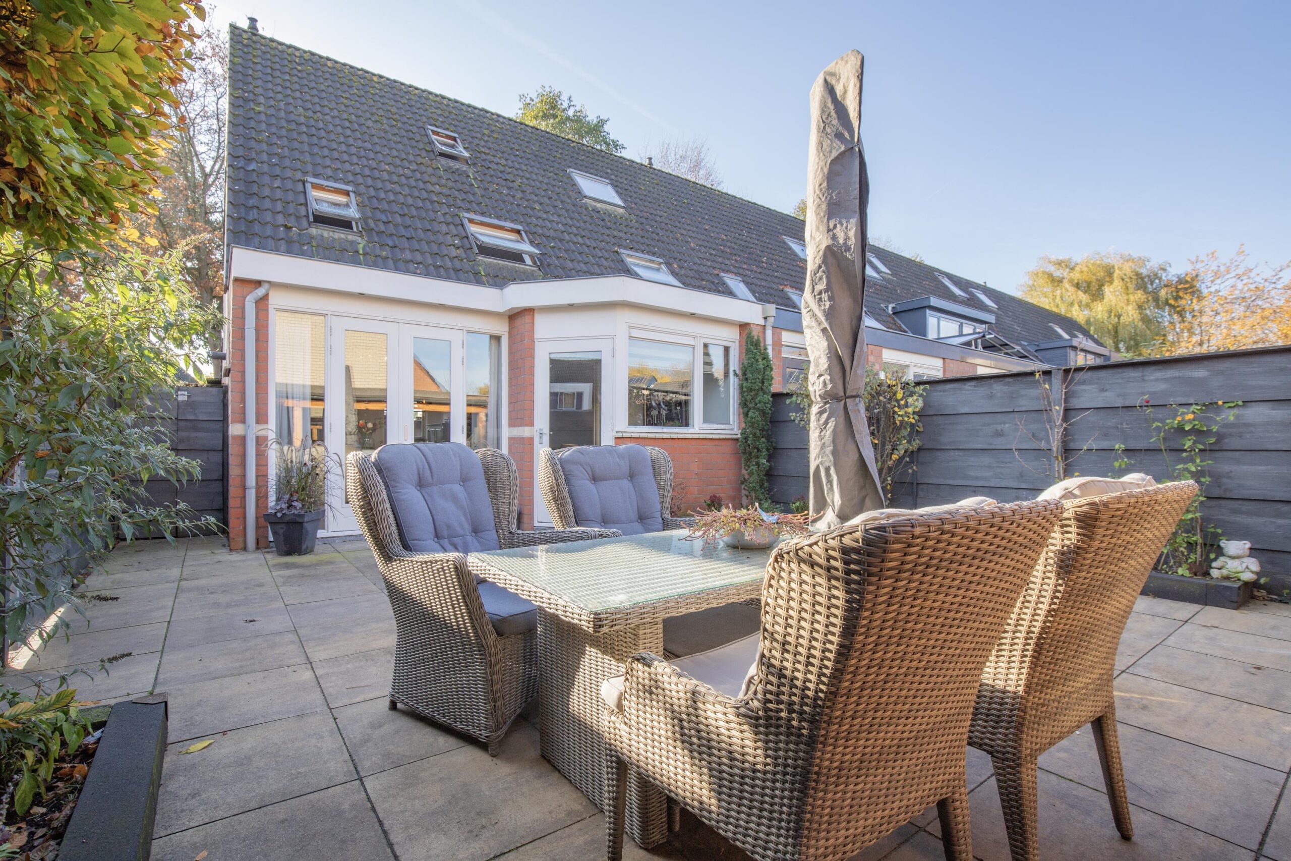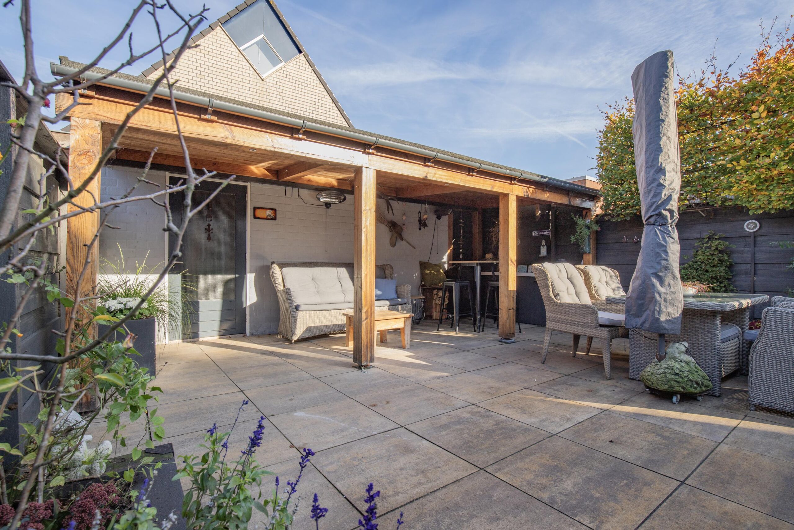 De achtertuin is onderhoudsvriendelijk aangelegd met een betegeld terras en een groene border. Achterin bevindt zich een veranda waar je het hele jaar door kunt genieten van het buitenleven. De schuur/garage is voorzien van elektriciteit en een praktische betonnen vloer.