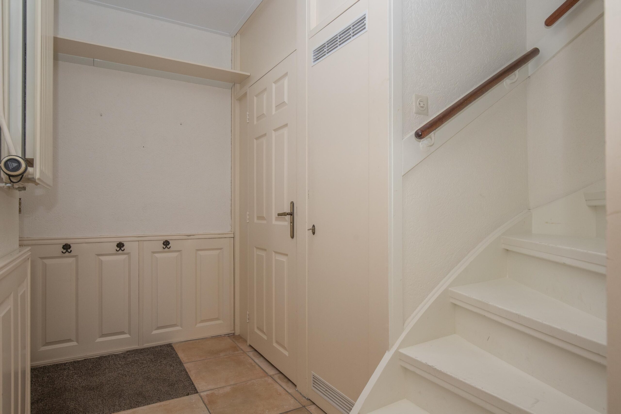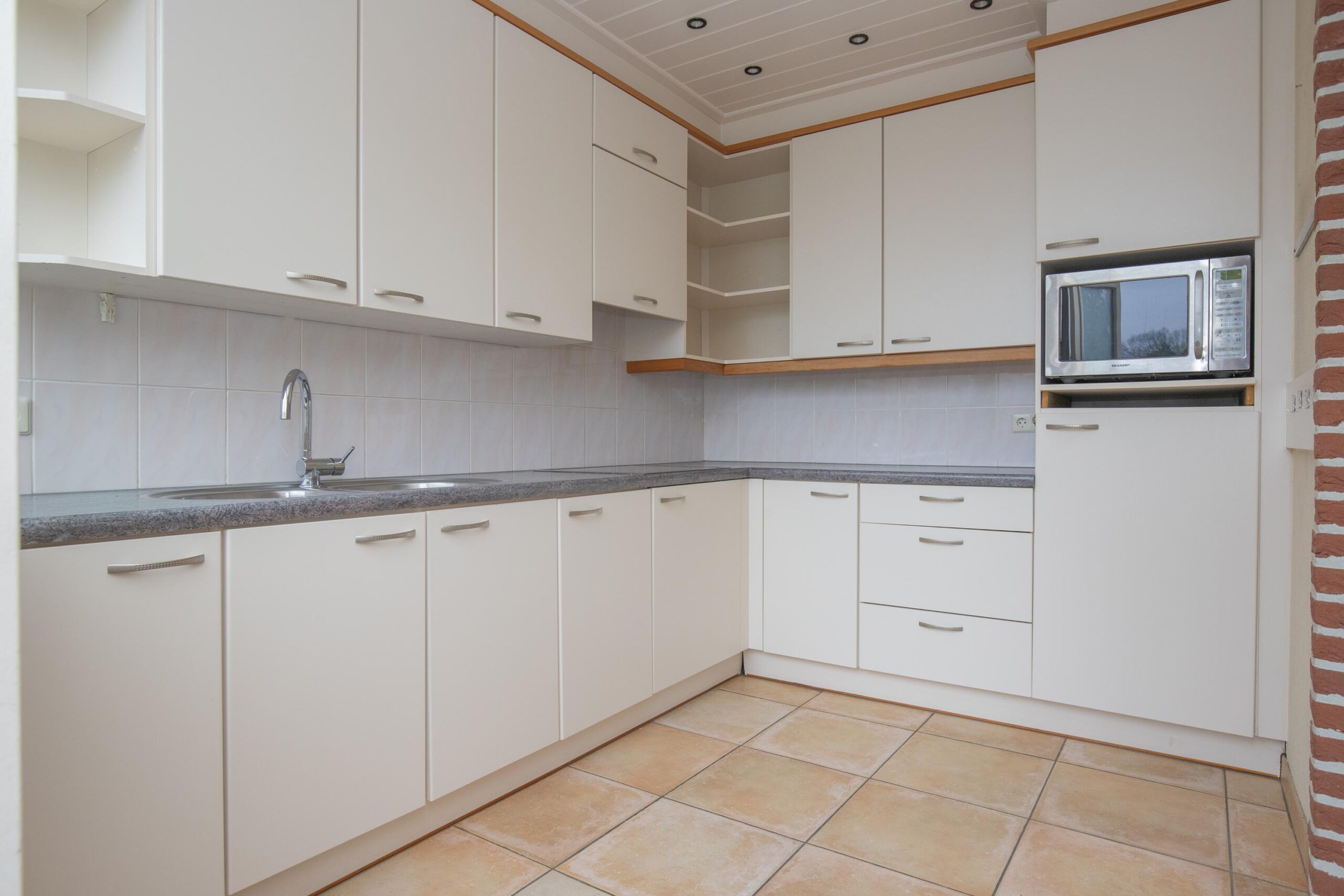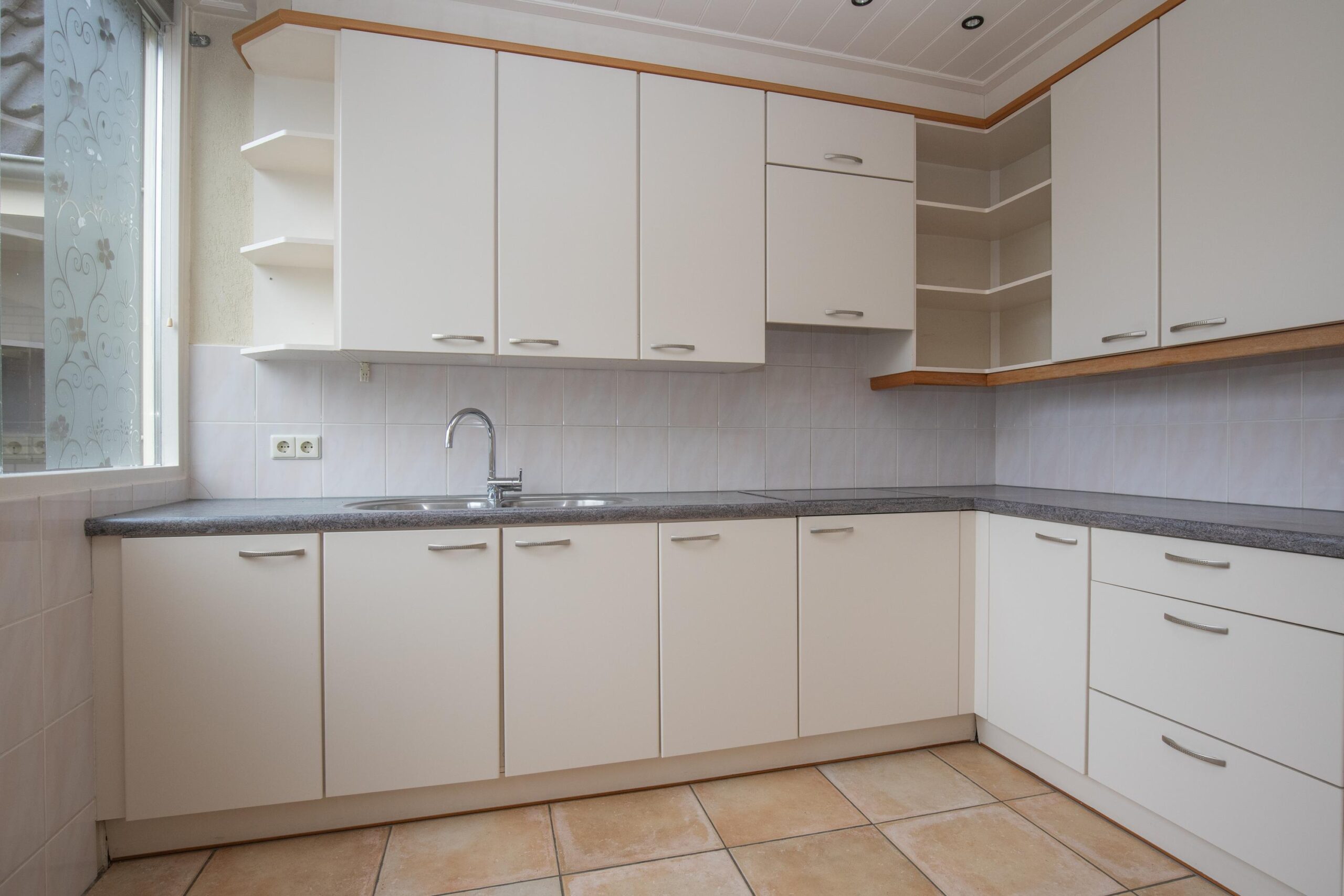 In de hal – voorzien van vloertegels, gestucte witte wanden en stijlvolle lambrisering – bevindt zich het toilet (licht betegeld en uitgerust met een fonteintje), de trap naar boven en de meterkast. De lichte woonkamer is een fijne leefruimte dankzij de grote ramen aan beide zijden. De tegelvloer met vloerverwarming loopt door in zowel de hal als de keuken en geeft het geheel een rustige, verzorgde uitstraling. De gestucte muren in zachte beige tint versterken het ruime gevoel. Aangrenzend ligt de L-vormige keuken, uitgerust met een 4-pits keramische kookplaat, koelkast, losse oven en magnetron en een vaatwasser. Vanuit de keuken stap je direct de tuin in.