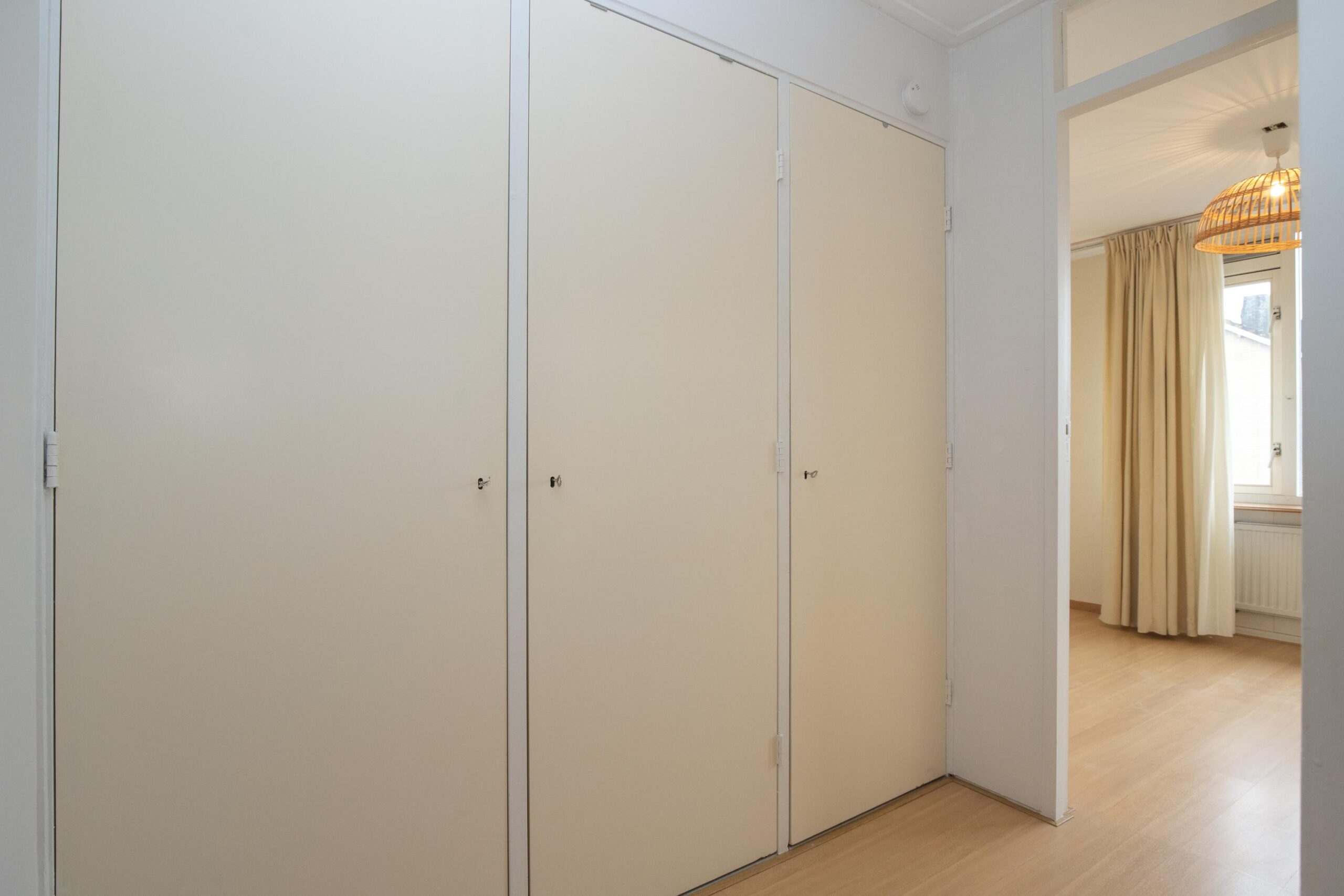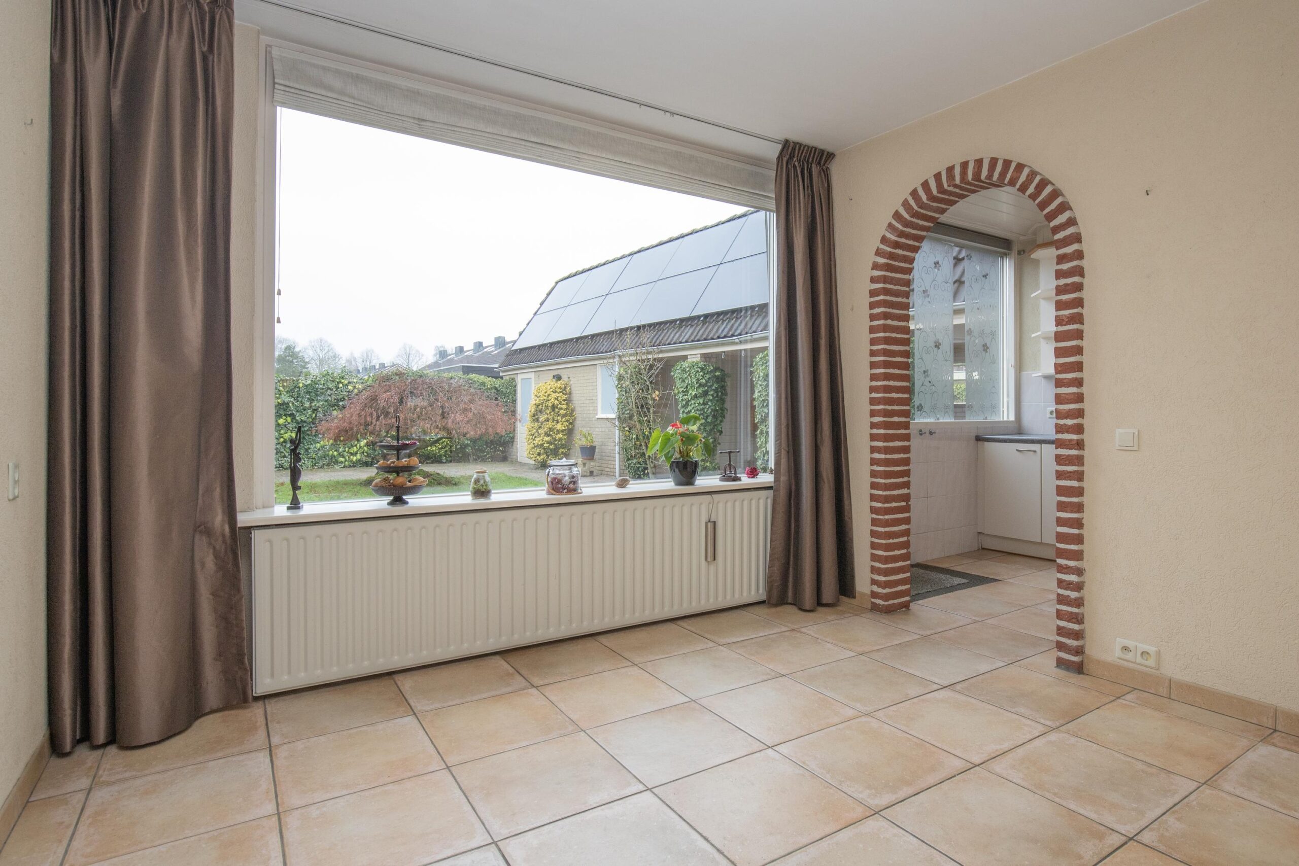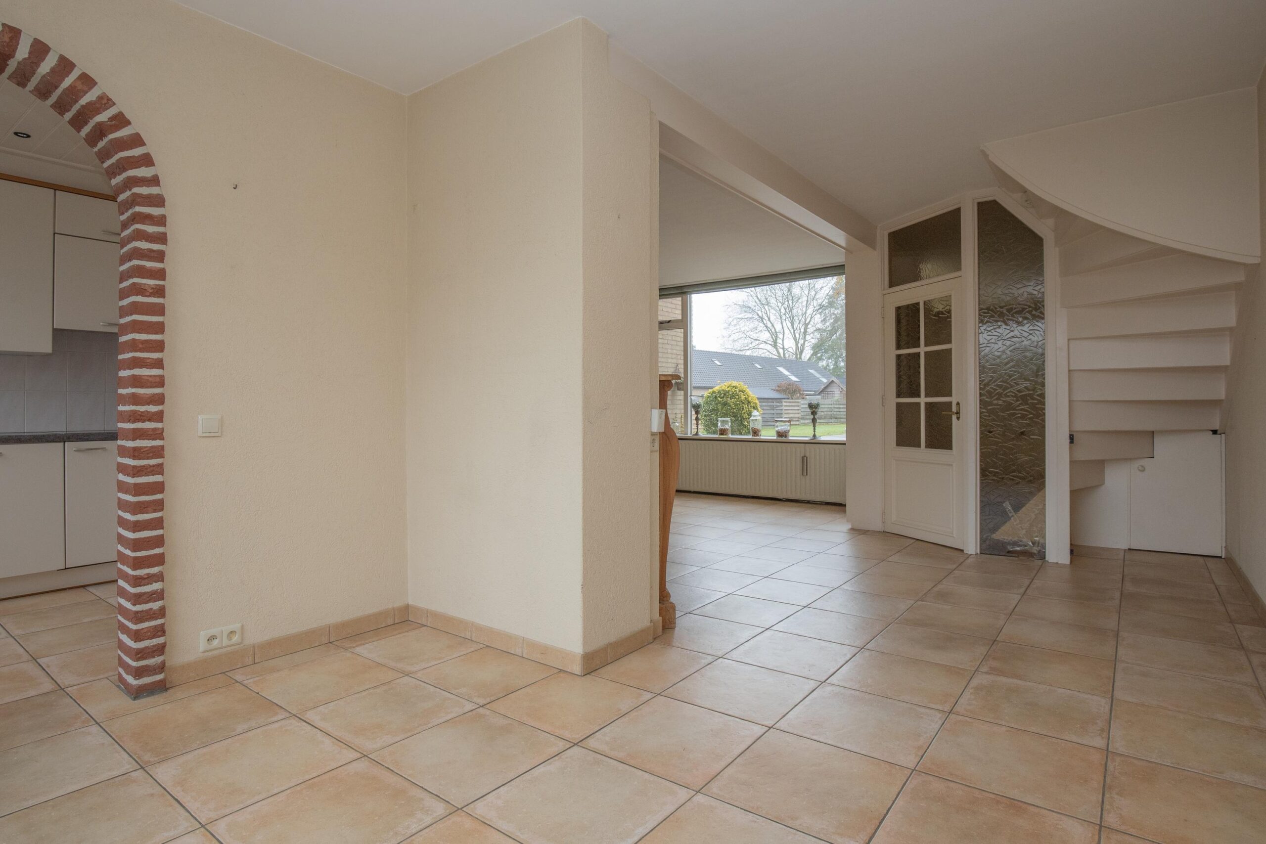 In de hal – voorzien van vloertegels, gestucte witte wanden en stijlvolle lambrisering – bevindt zich het toilet (licht betegeld en uitgerust met een fonteintje), de trap naar boven en de meterkast. De lichte woonkamer is een fijne leefruimte dankzij de grote ramen aan beide zijden. De tegelvloer met vloerverwarming loopt door in zowel de hal als de keuken en geeft het geheel een rustige, verzorgde uitstraling. De gestucte muren in zachte beige tint versterken het ruime gevoel. Aangrenzend ligt de L-vormige keuken, uitgerust met een 4-pits keramische kookplaat, koelkast, losse oven en magnetron en een vaatwasser. Vanuit de keuken stap je direct de tuin in.