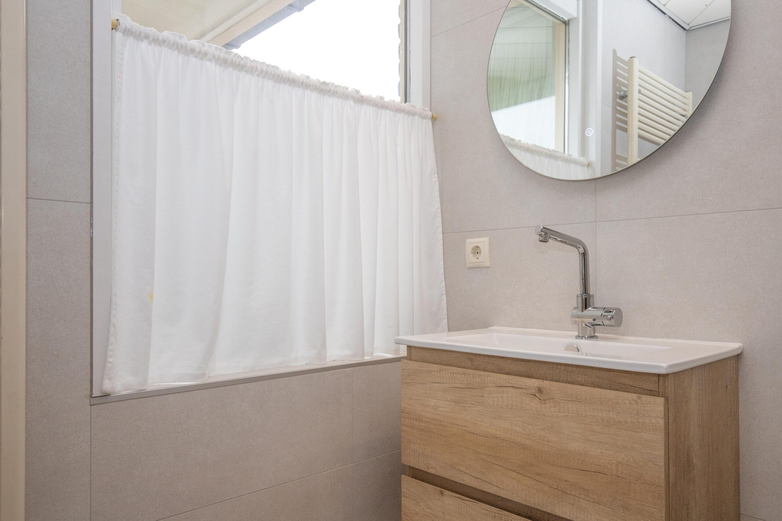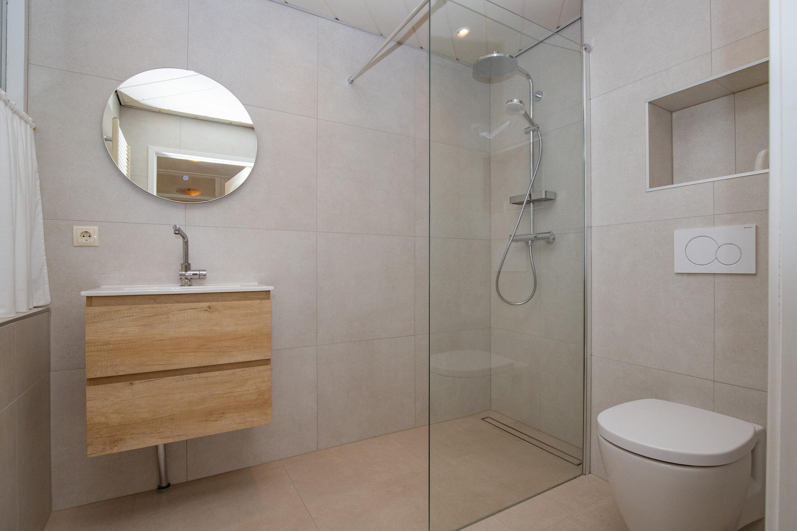 •Badkamer: modern met licht tegelwerk, inloopdouche, wastafelmeubel met spiegel met touch-verlichting en wandcloset