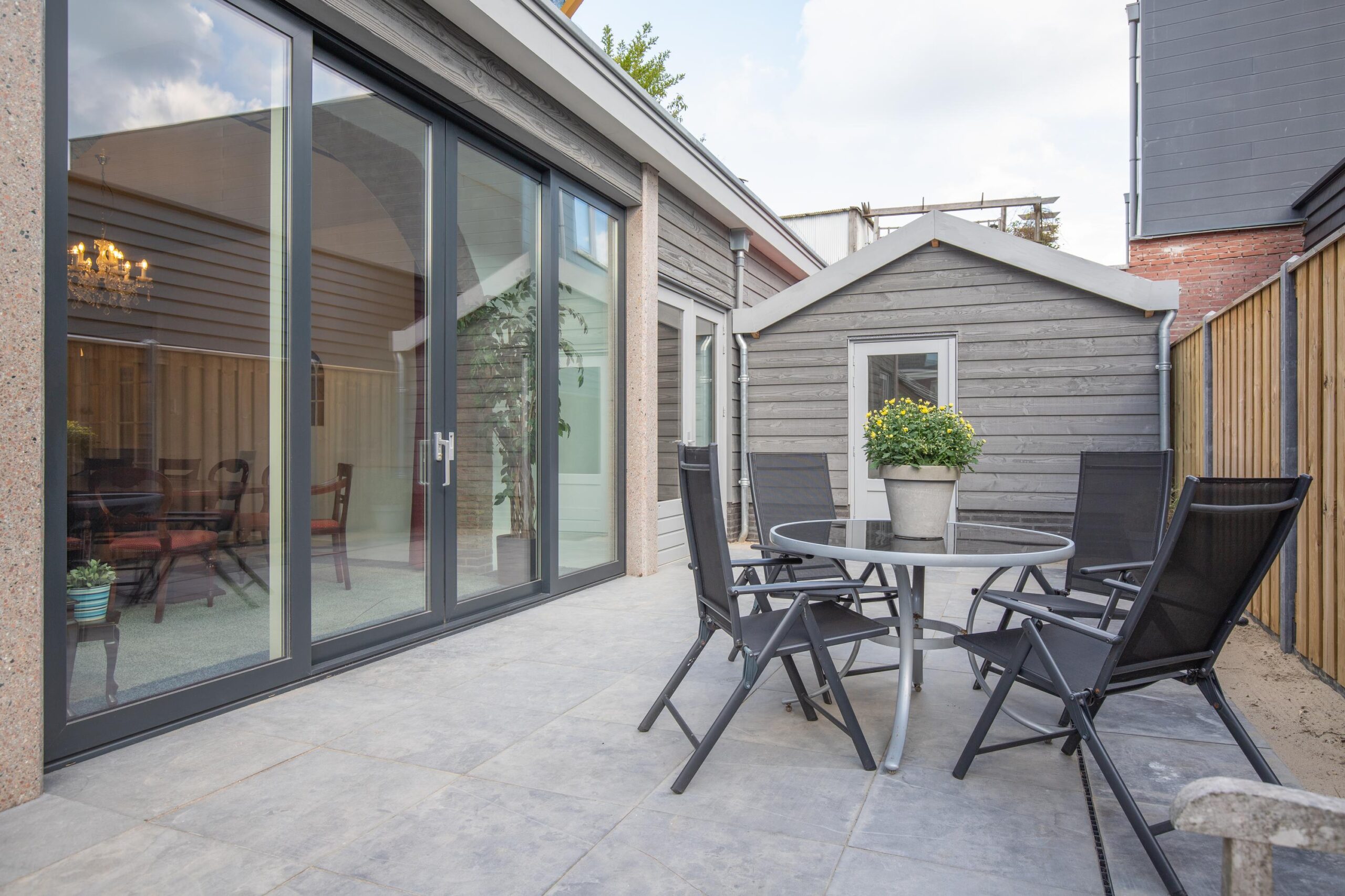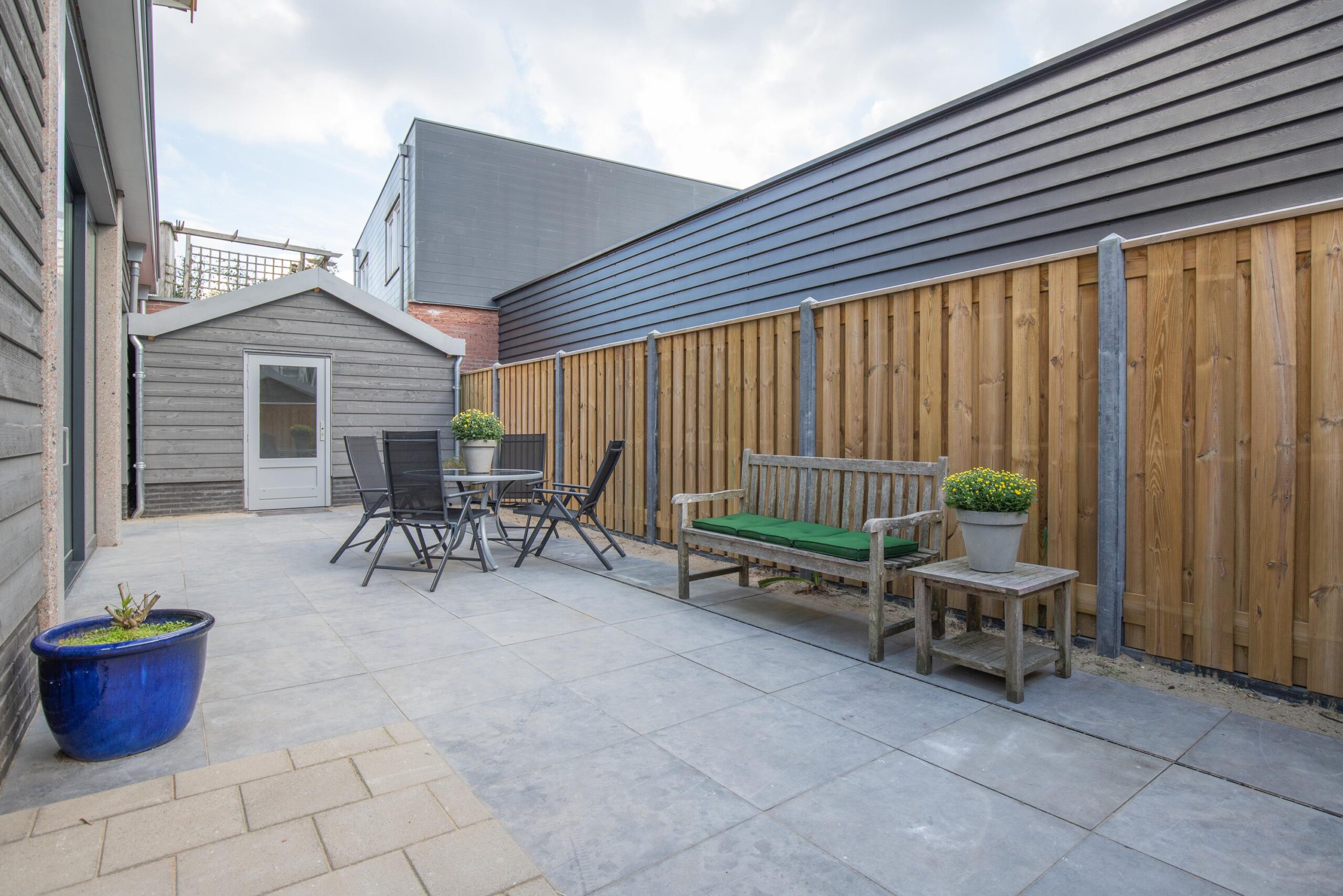 Geniet van de heerlijke, zonnige, onderhoudsarme achtertuin met geheel vernieuwde houten schutting en berging voor het opbergen van uw tuinstoelen en fietsen