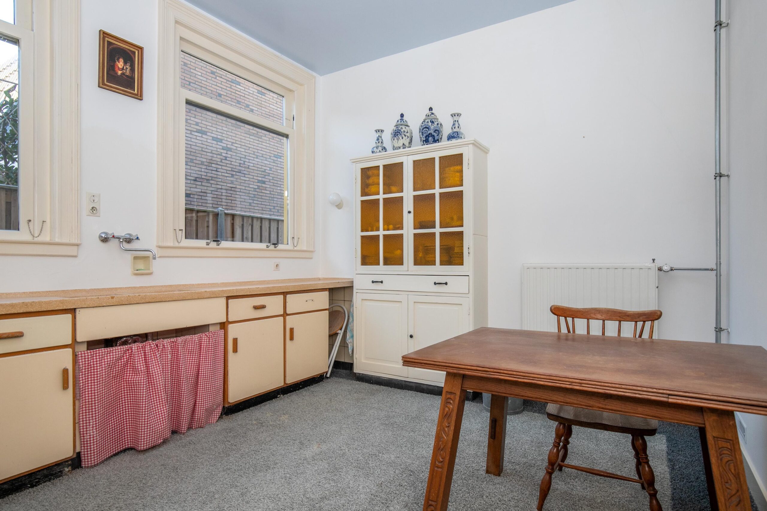 Uniek is de multifunctionele ruimte van maar liefst 33 m² – ideaal als eetkamer, atelier, werkkamer of hobbyruimte. Dankzij de grote glazen schuifpui staat deze ruimte in directe verbinding met het sfeervolle, besloten achterterras van ca. 40 m². De authentieke keuken met stenen werkblad en klassieke gootsteen is een knipoog naar het verleden, en wordt gecomplementeerd door een praktische bijkeuken.
