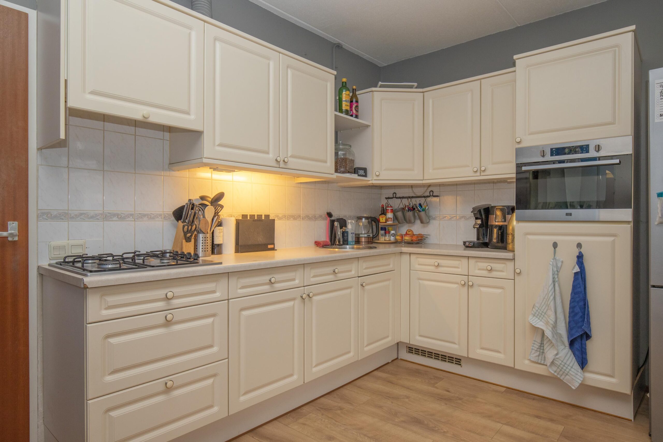 • Slim ingedeelde halfopen keuken in hoekopstelling, voorzien van diverse inbouwapparatuur