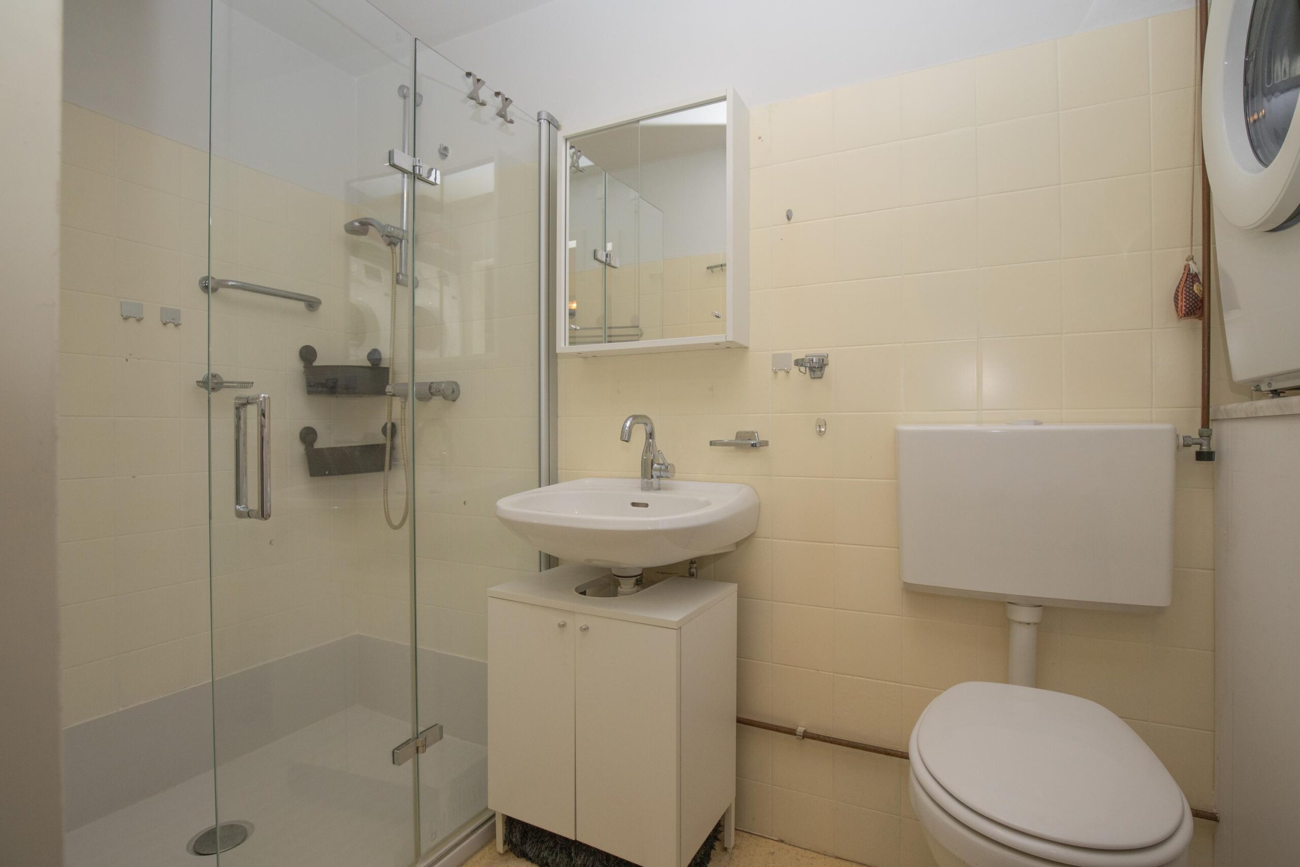 • Volledig betegelde badkamer met inloop douchecabine, toilet, wastafel én witgoedaansluiting