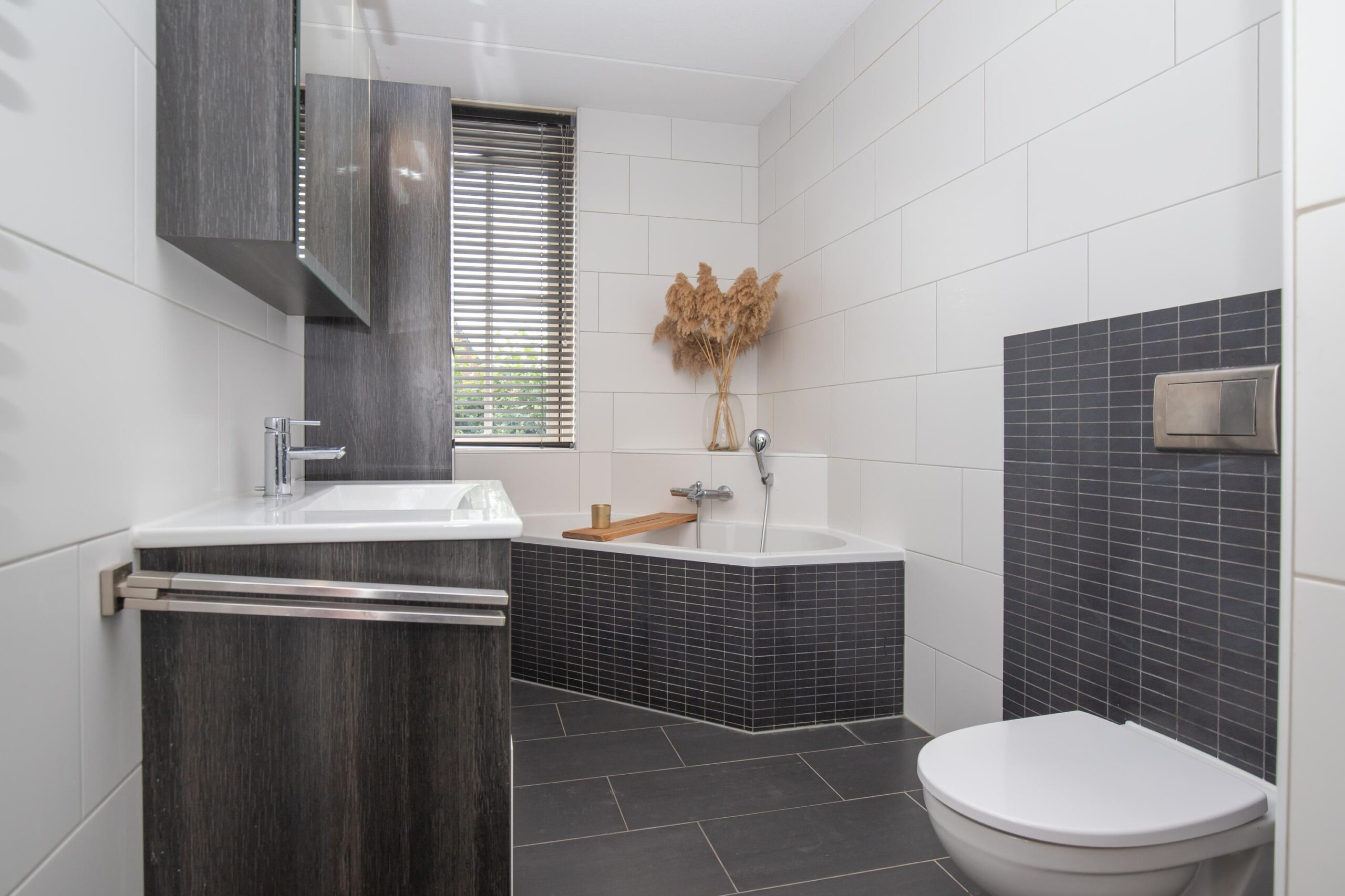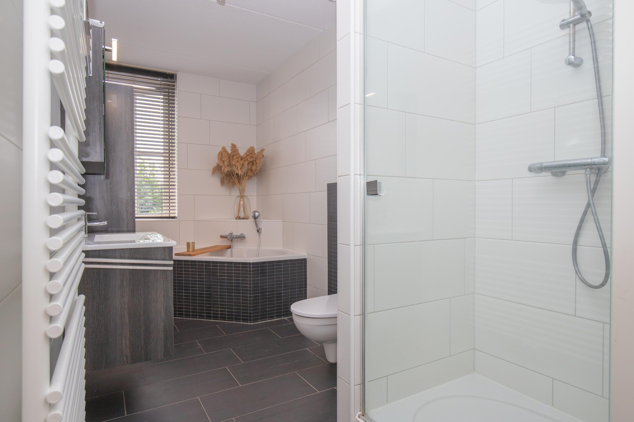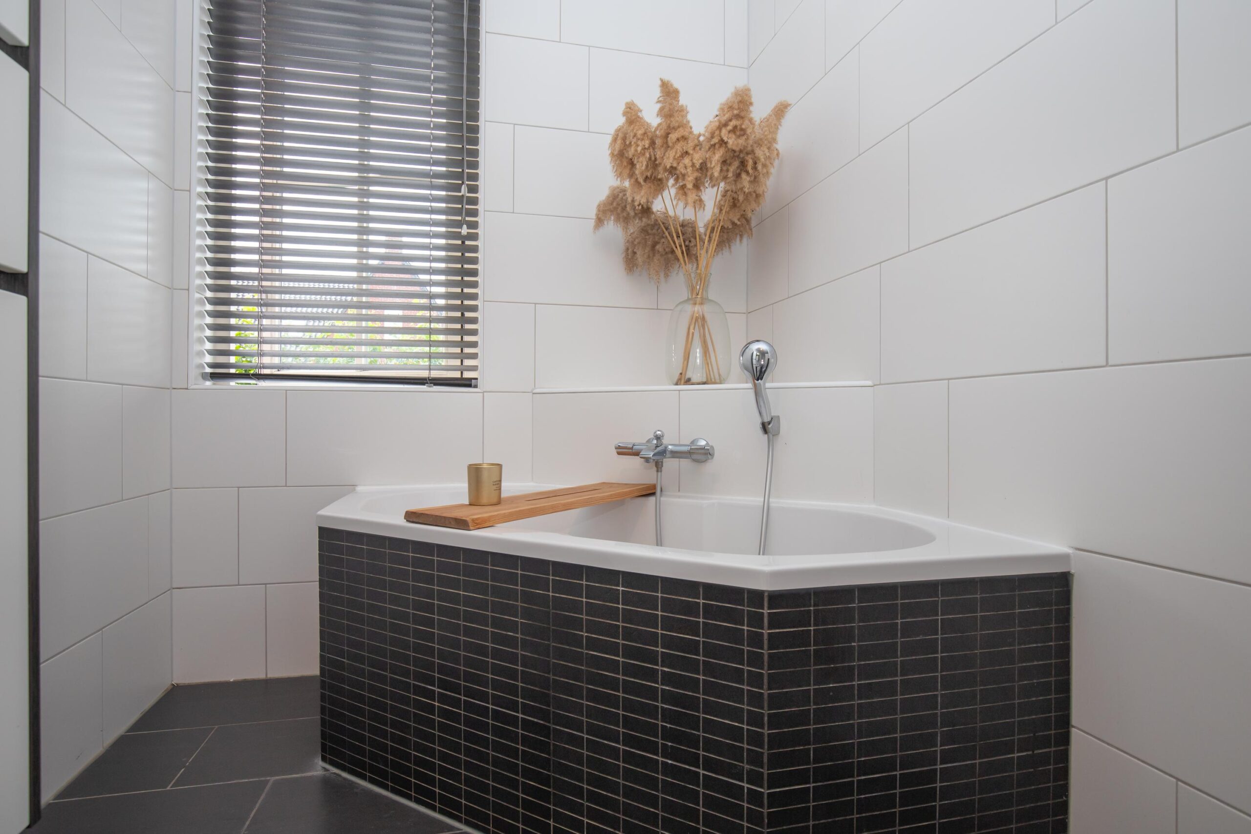 De overloop met vaste kast biedt toegang tot drie ruime slaapkamers, waarvan twee met ingebouwde kastruimte. De luxe badkamer is stijlvol betegeld en beschikt over een ligbad, inloopdouche, tweede toilet en een modern wastafelmeubel.