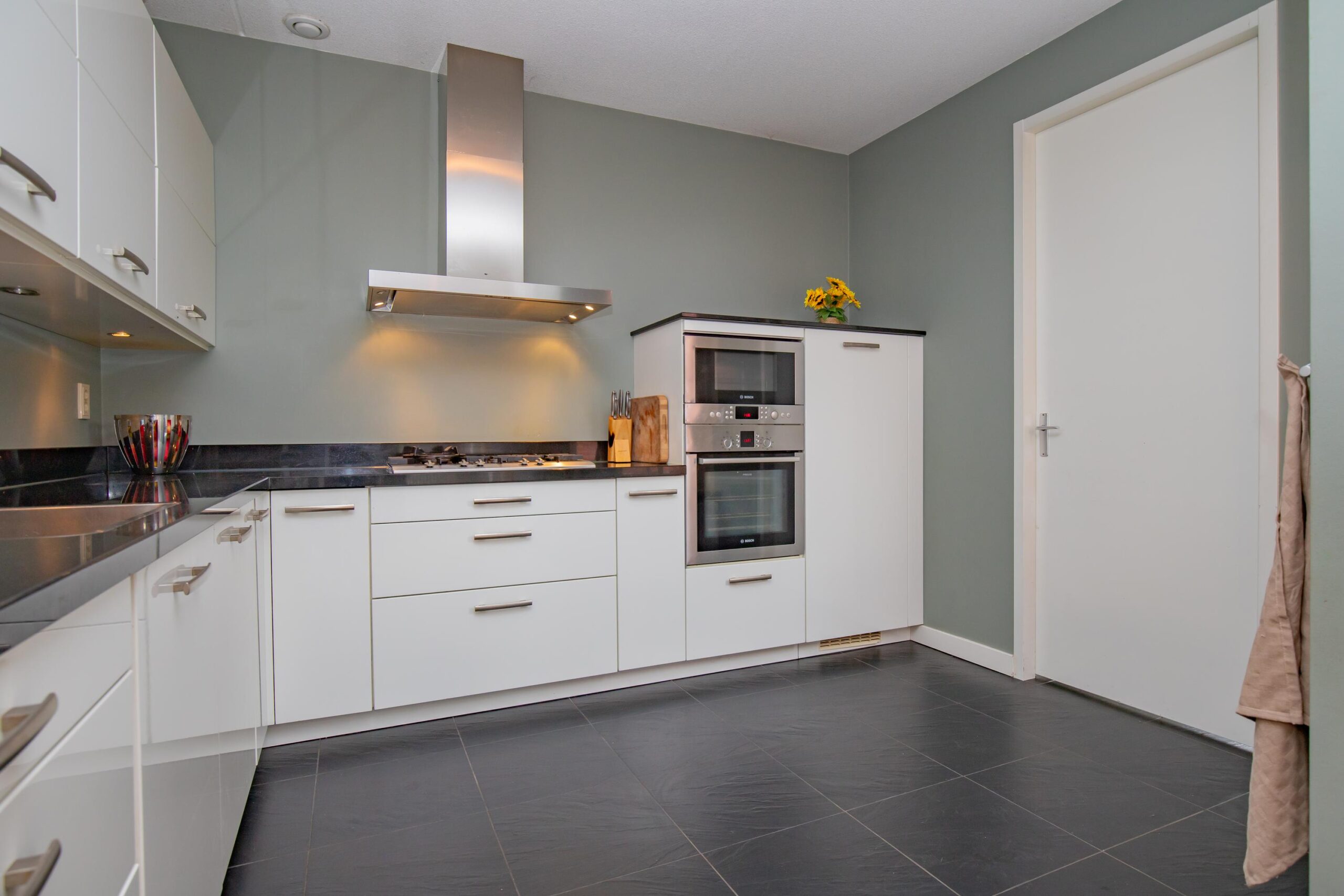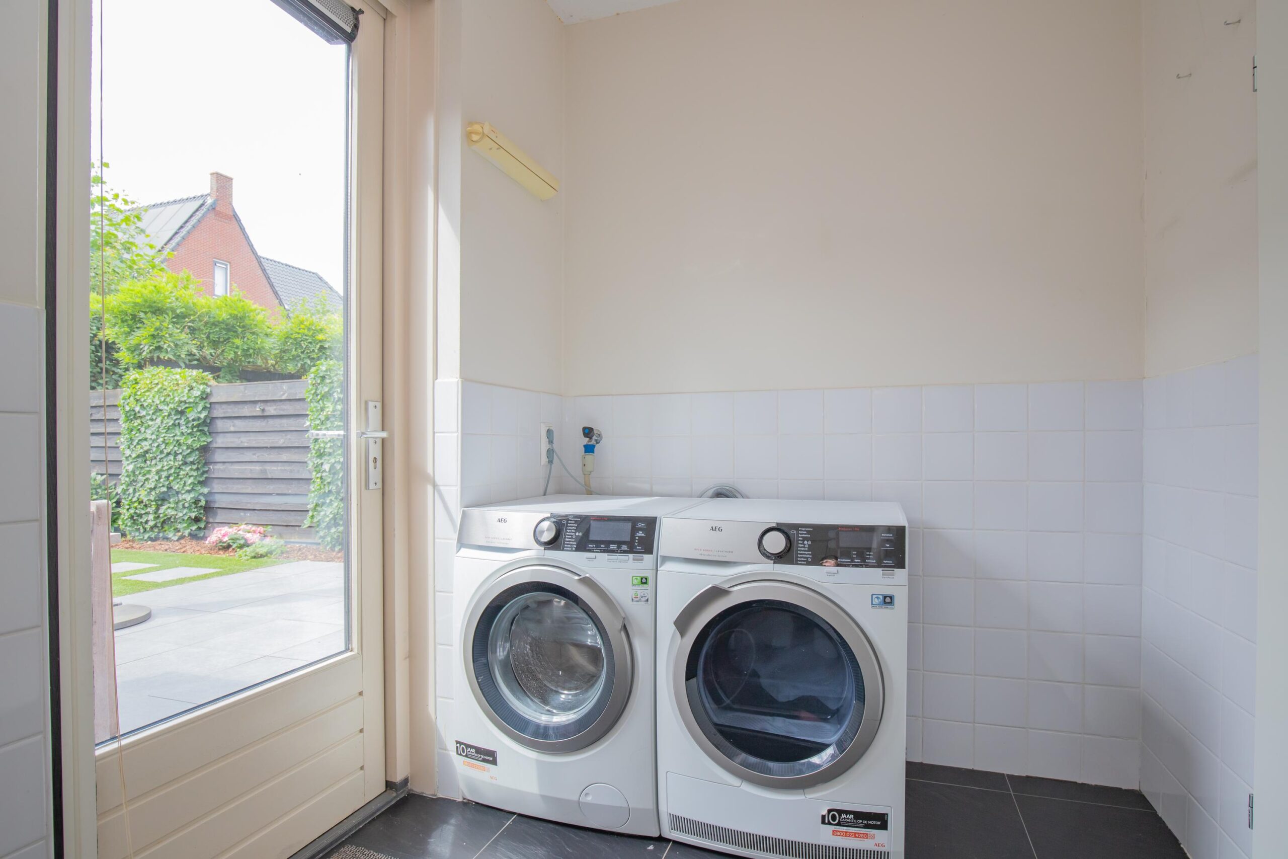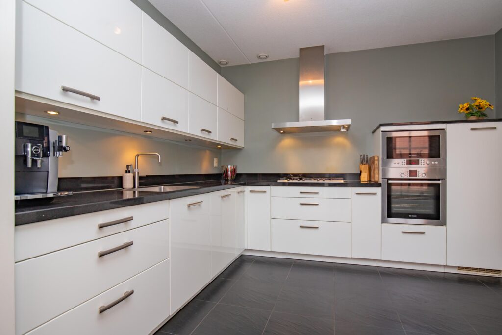 Via de ruime hal met meterkast, modern toilet en trapopgang bereikt u de lichte woonkamer met grote raampartijen – een heerlijke plek voor gezellig samenzijn. De royale woonkeuken met openslaande deuren naar de tuin biedt volop ruimte voor een grote eettafel en is compleet uitgerust met hoogwaardige inbouwapparatuur, waaronder een 5-pits gasfornuis, quooker, oven, magnetron, vaatwasser, koelkast en afzuigkap. Grenzend aan de keuken vindt u de bijkeuken met witgoedaansluitingen en toegang tot de geïsoleerde garage, die voorzien is van een praktische kastenwand, uitstortgootsteen en dubbele deuren naar de oprit. De gehele begane grond is voorzien van een warme eikenhouten vloer en strak gestuukte wanden.